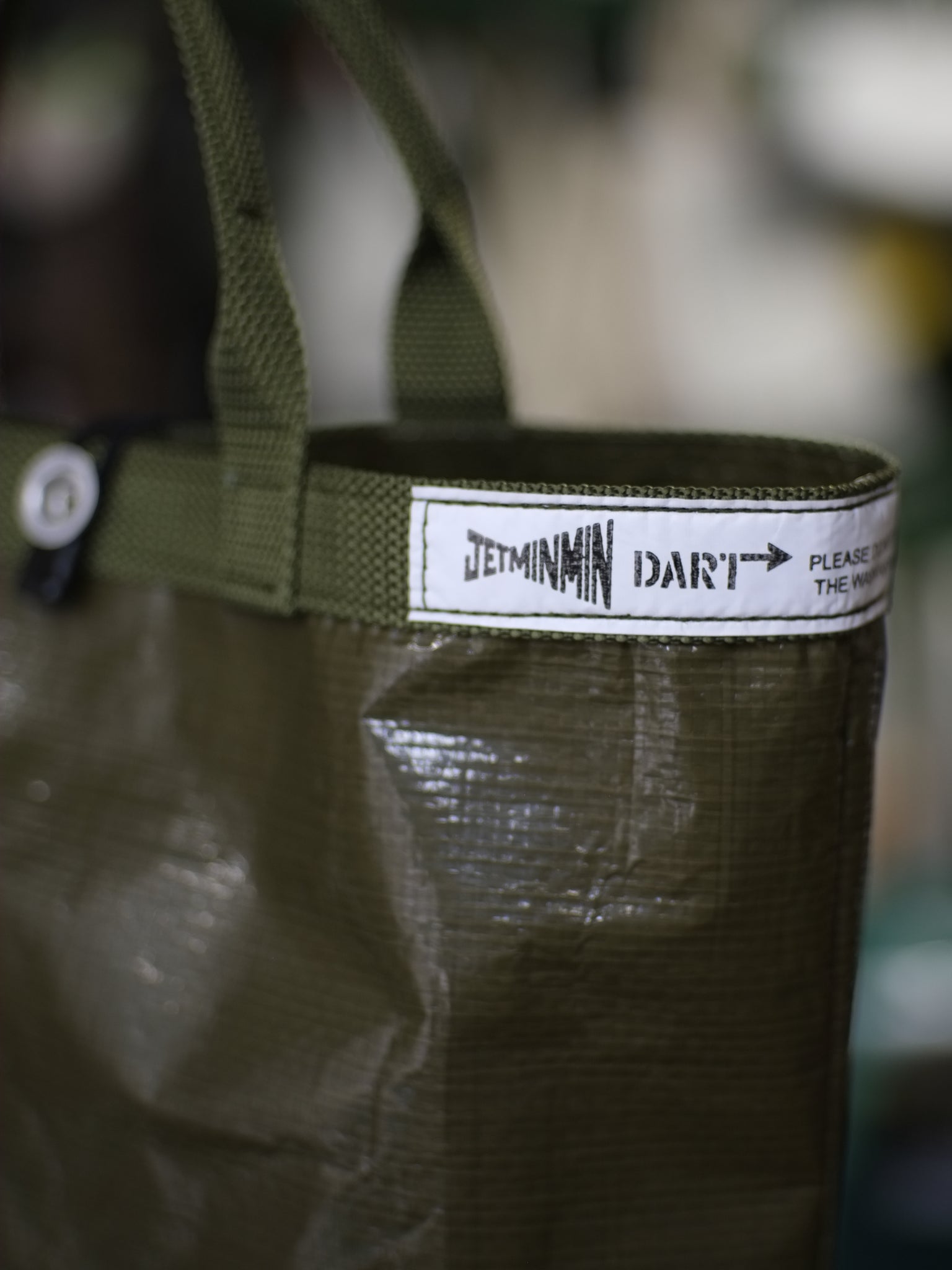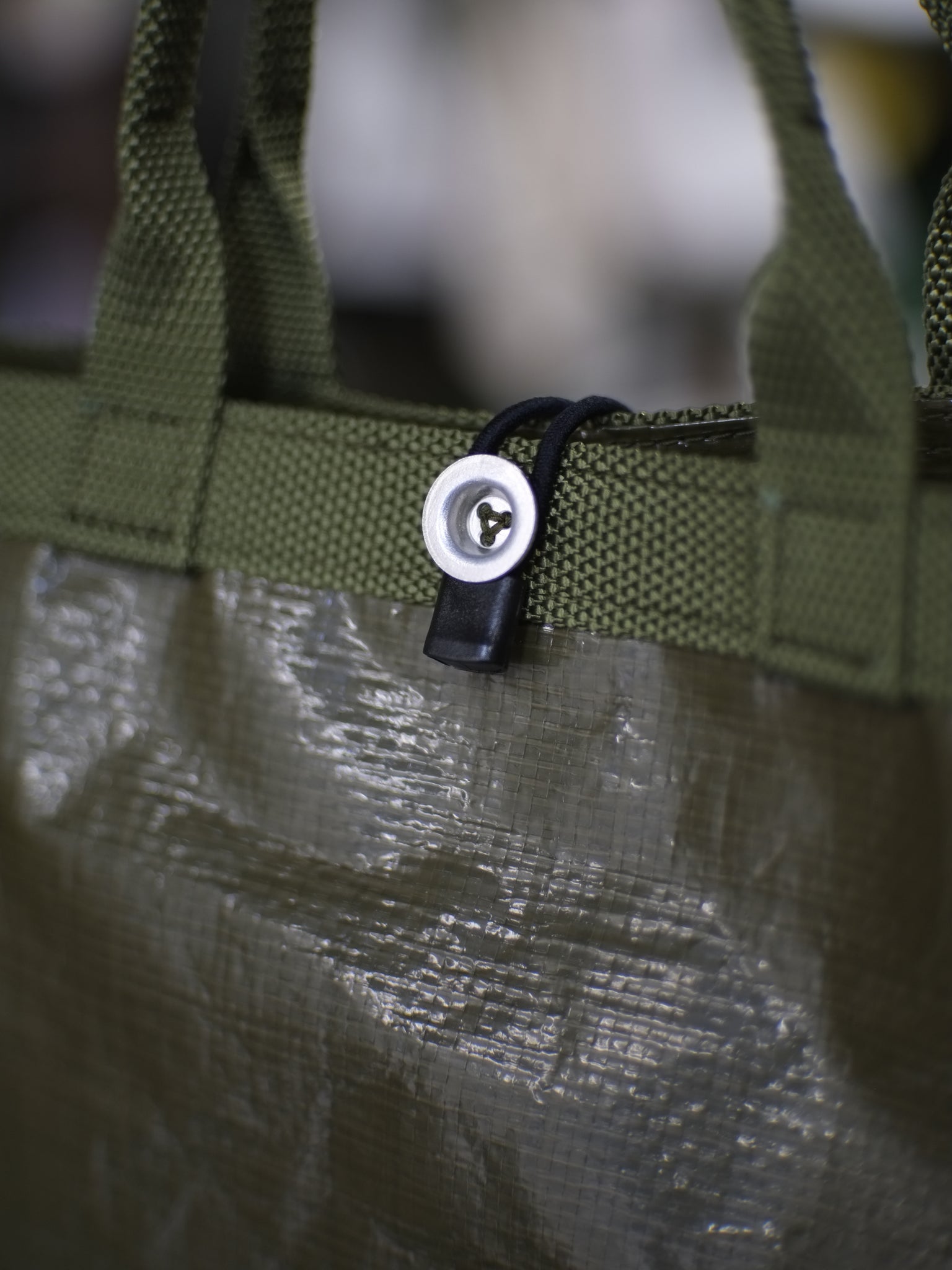 ループに付いたゴム紐は折りたたむ時に便利です。これで用途がぐんと広がって、キャンプやビーチや雪山へのレジャーから、エコバッグとしてスーパーや海産物の買い出しまで、また雨の日の外出やロケや・・・もう他のトートはいらなくなるかも。