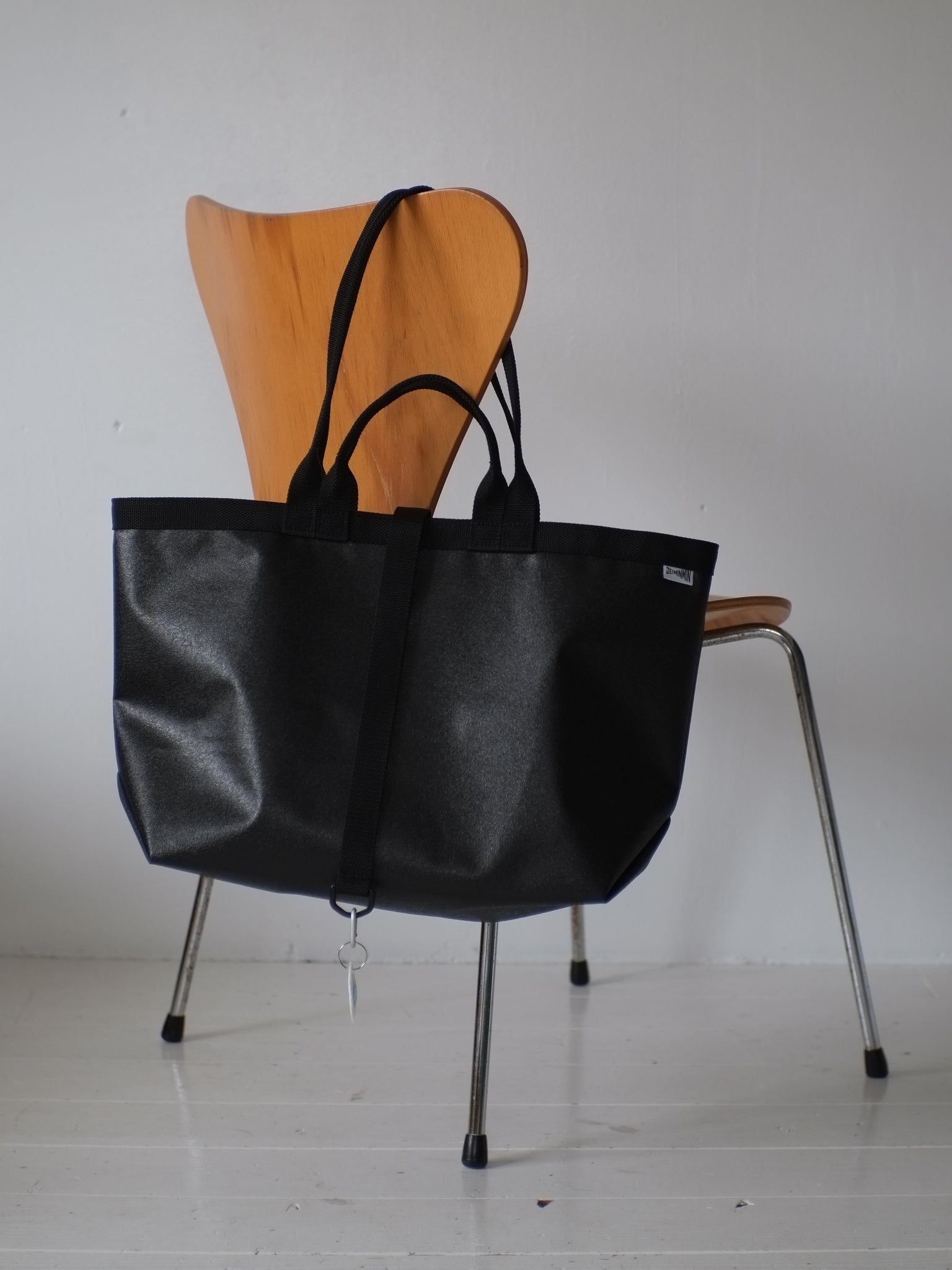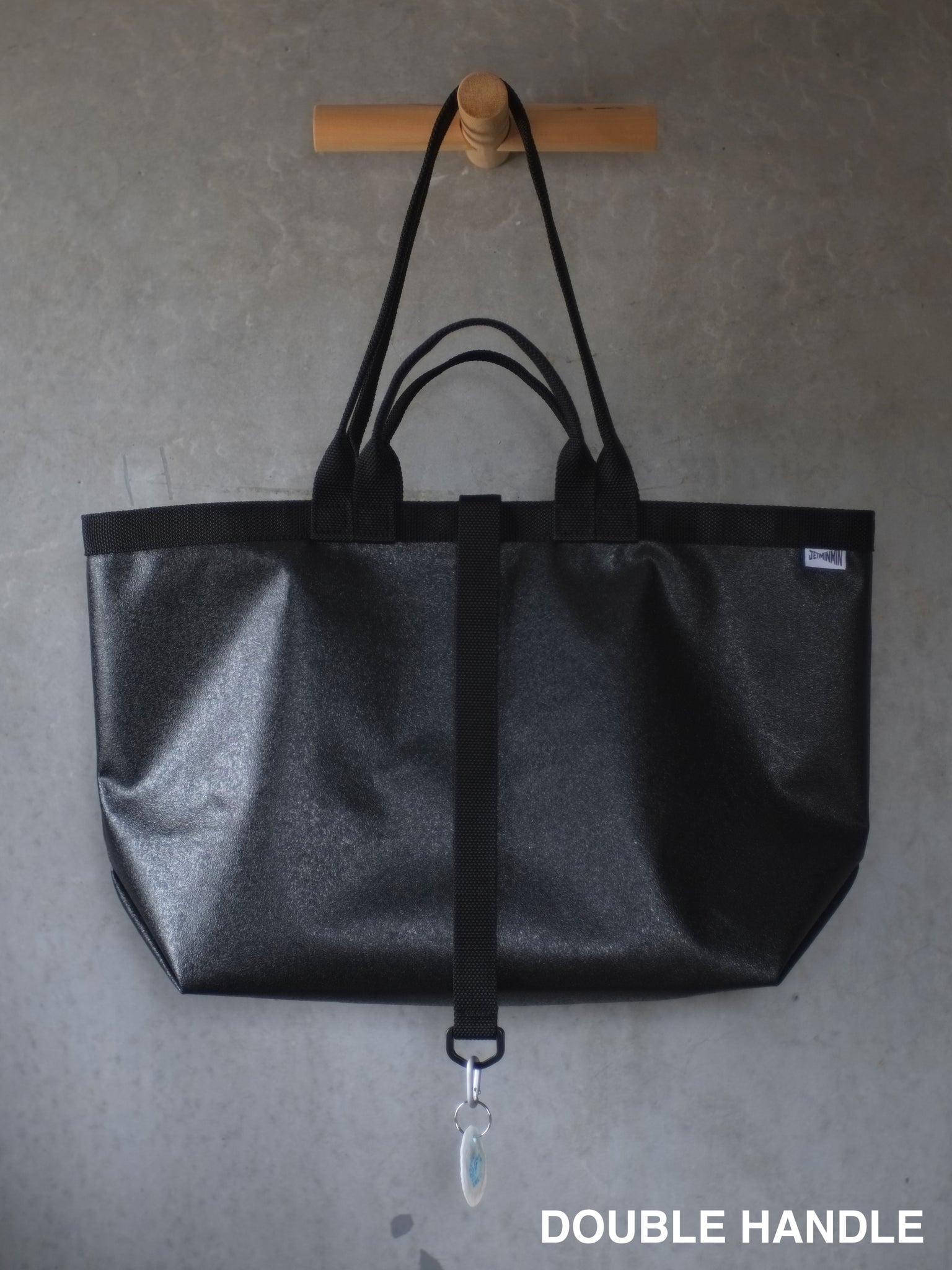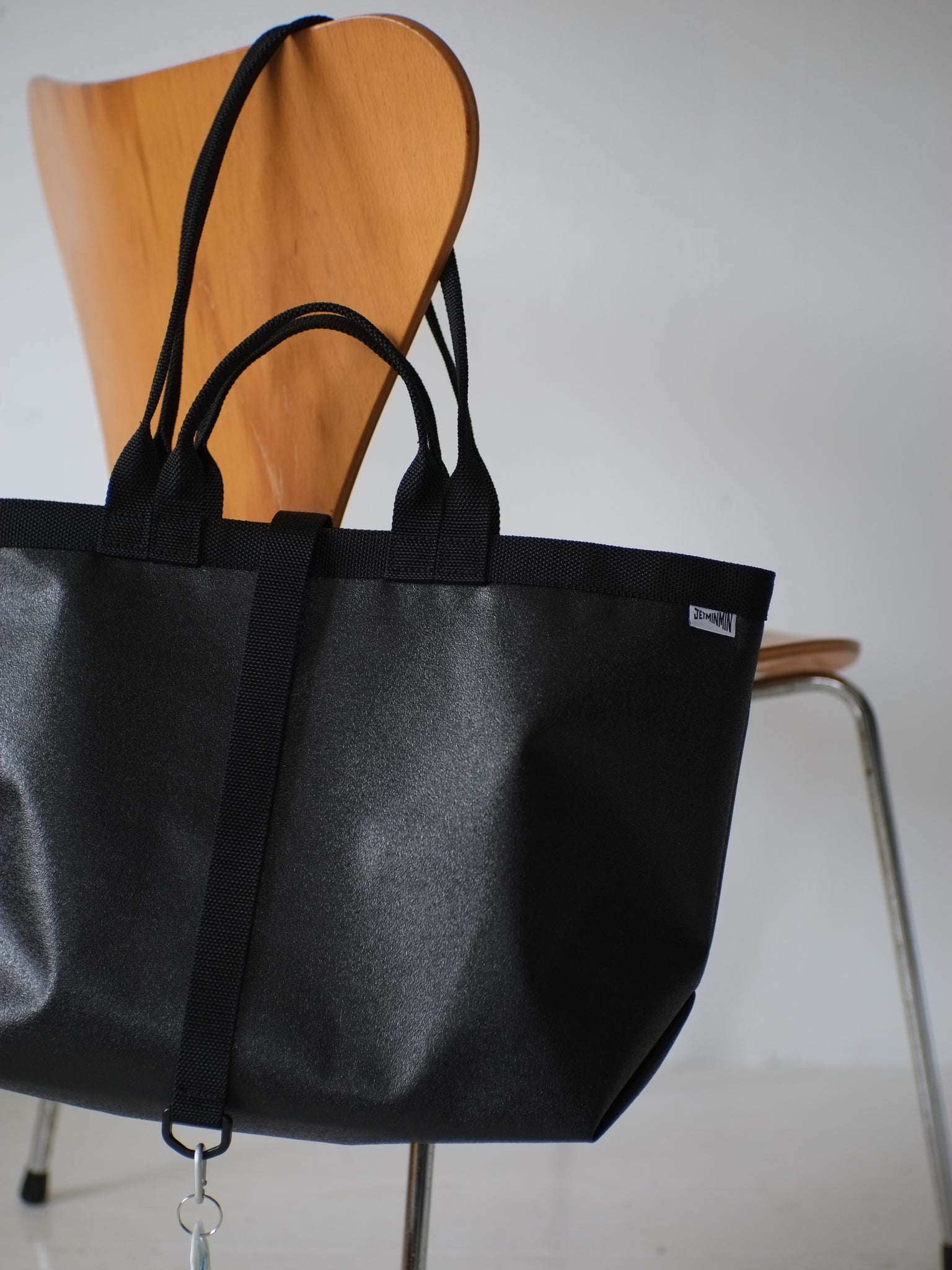 このビニールトートは活躍の幅が広いので、通勤から休日のお出かけまで毎日メイントートとしてお使いくださる方が多く、そんなみなさまからキーがバッグの中で迷子にならなくて済む機能が欲しいというご要望をいただいたので、小さなカラビナ付きキーループを標準装備にしました。