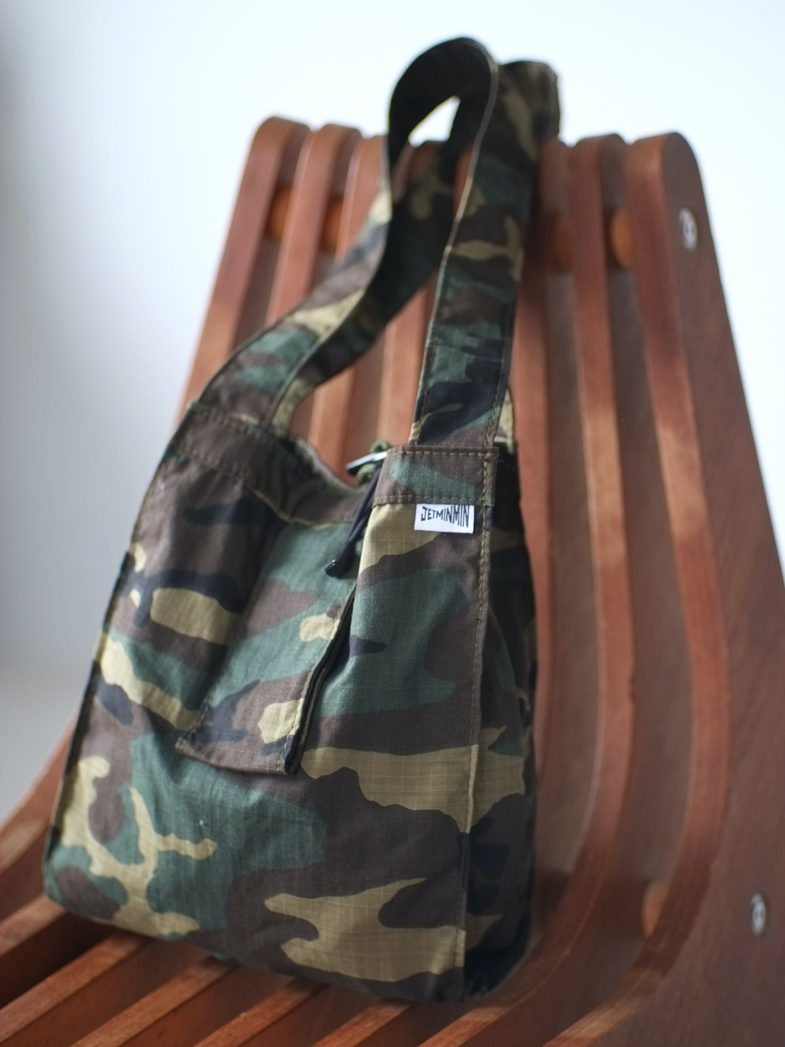 JETMINMINのロングセラーのレジ袋をリデザインしたエコバッグ"MARKET"。 ループをボタンに掛けて口を閉められます。折りたたみができます。