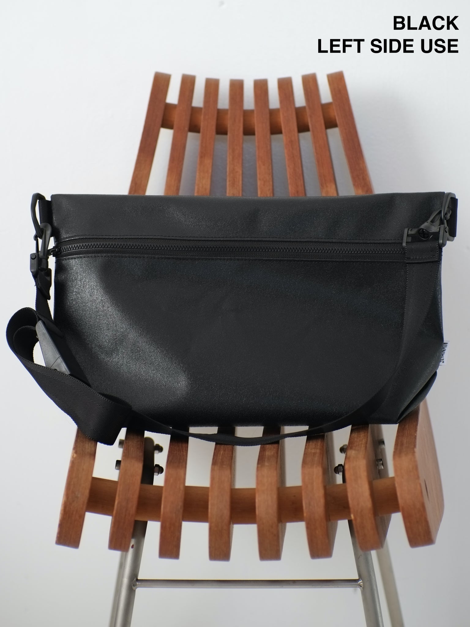 ジッパー巾40cmのビニールテント地のボディーに、長さを自由に調節可能な浜松産シートベルトをセットした、シンプルな斜めがけバッグです。