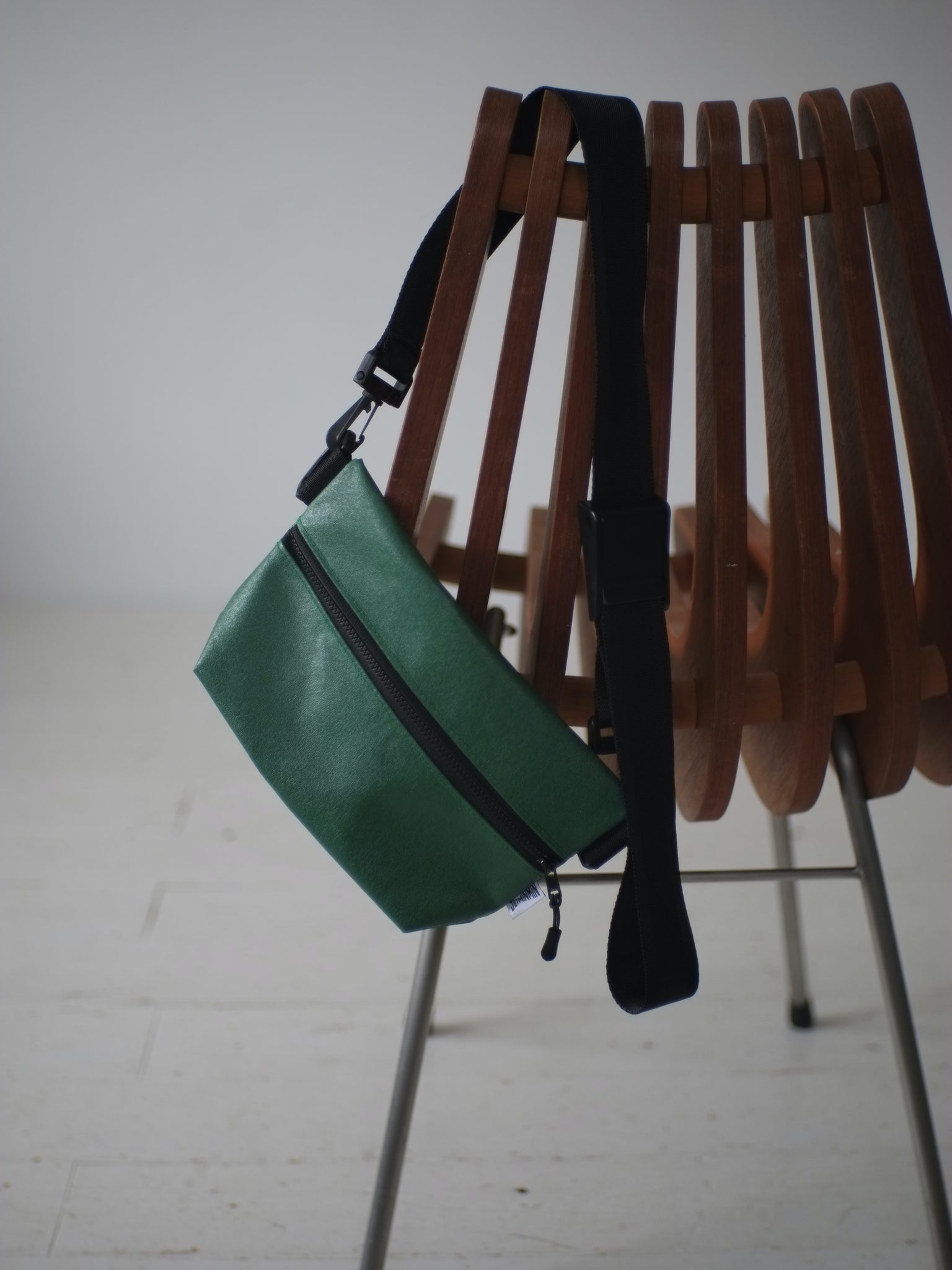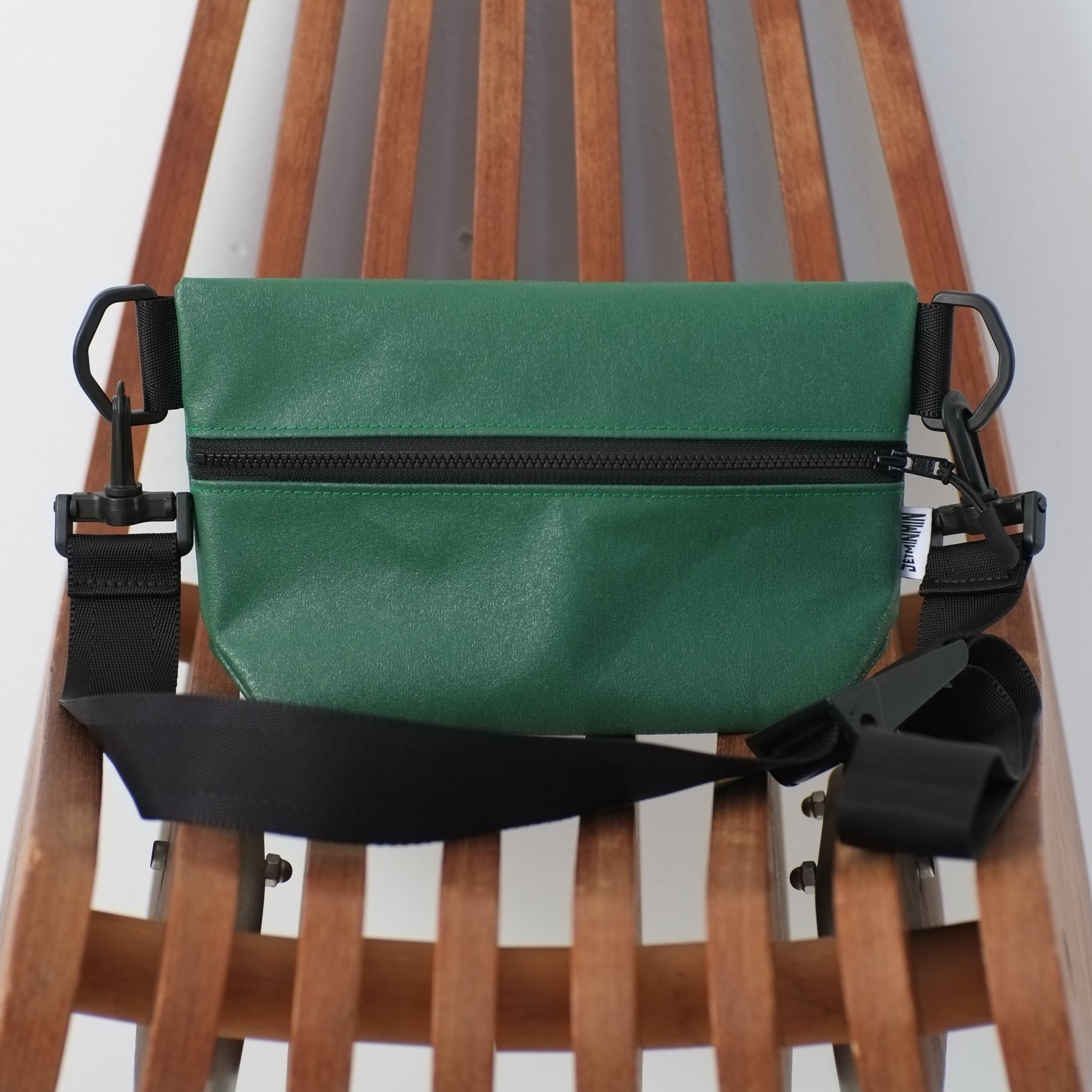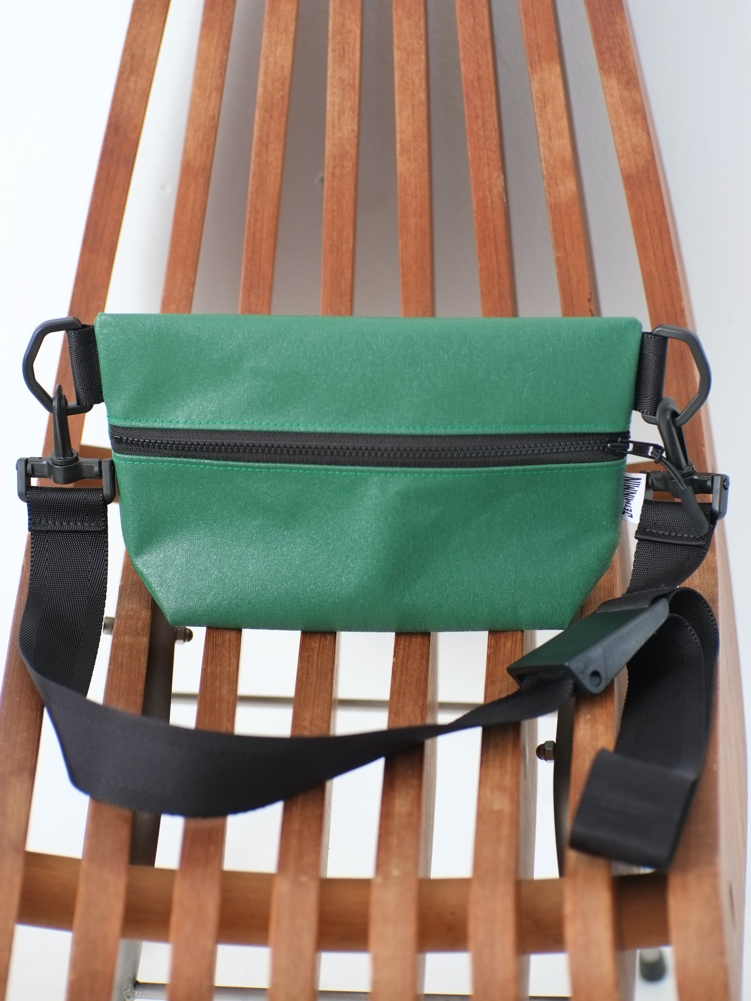 ジッパー巾25cmのビニールテント地のボディーに、長さを自由に調節可能な浜松産シートベルトをセットした、シンプルな斜めがけバッグです。
