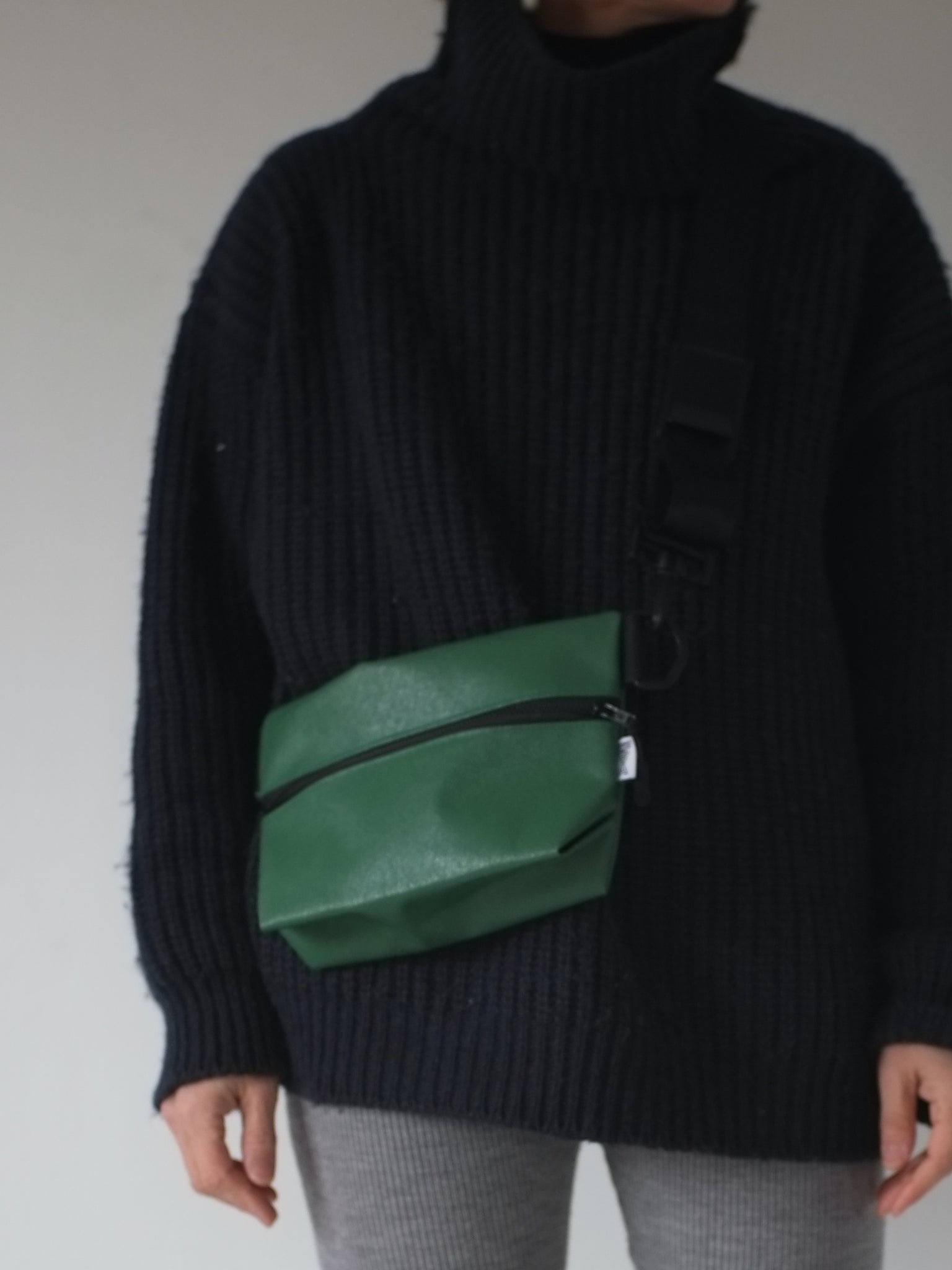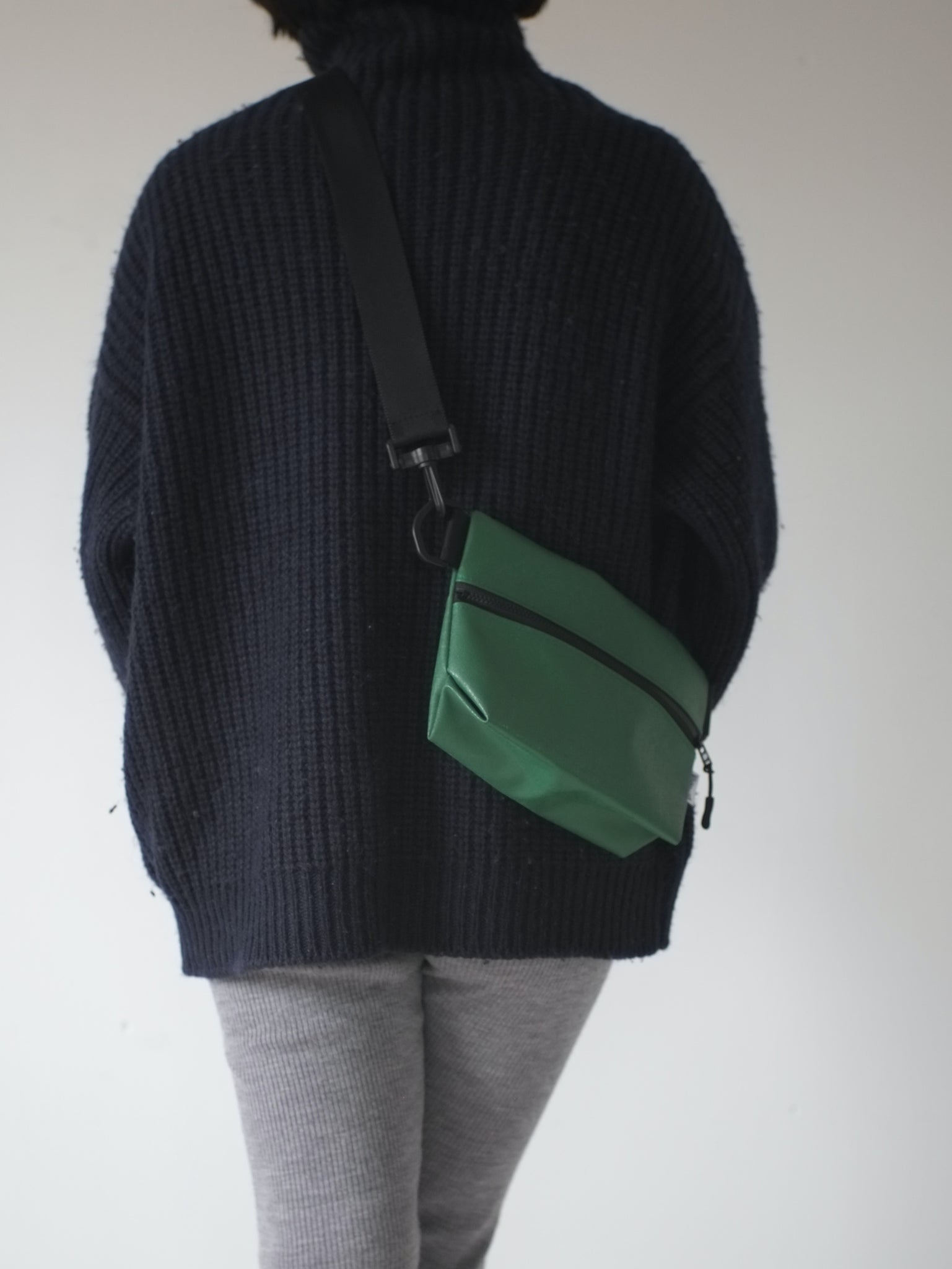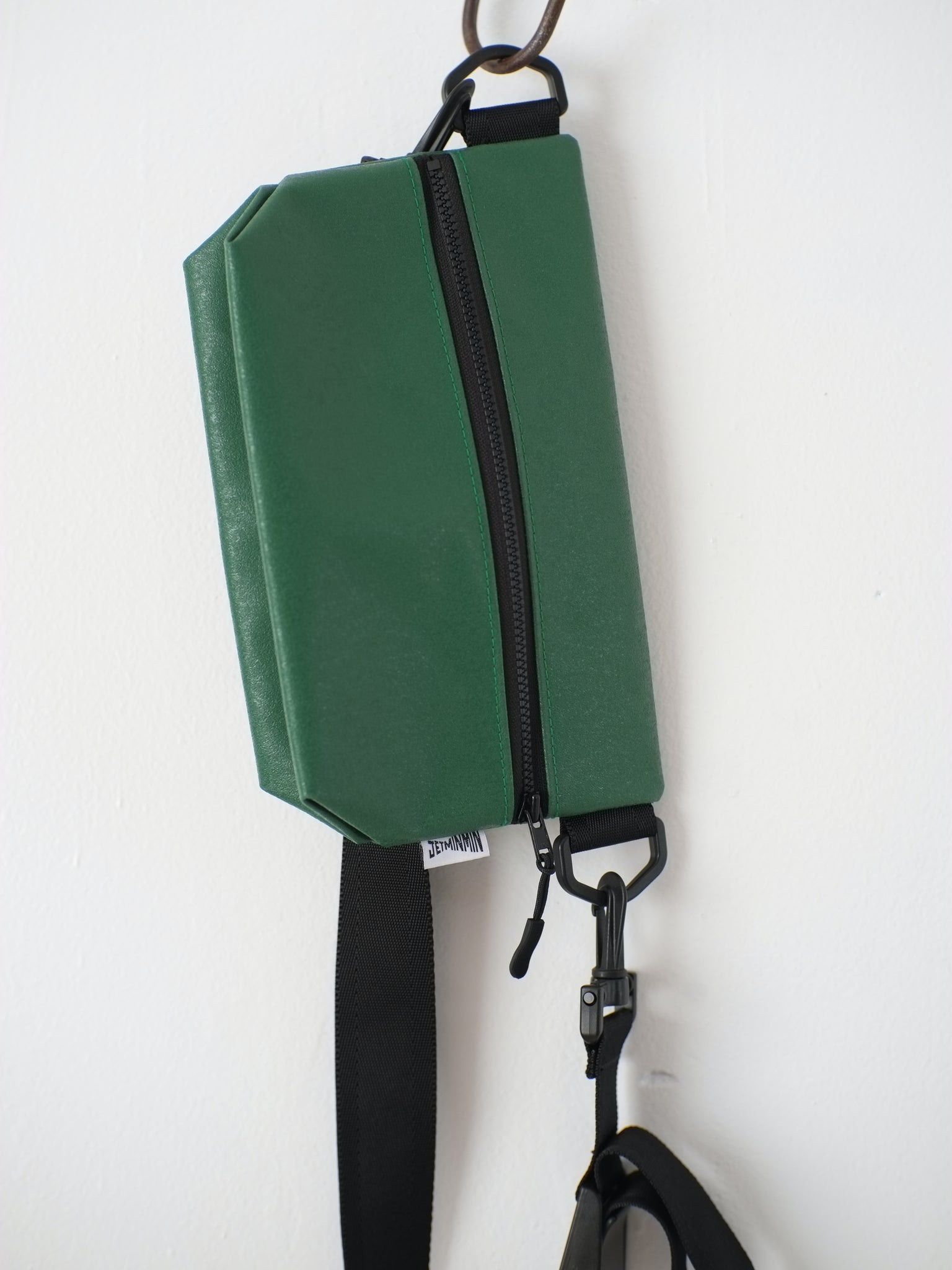ジッパー巾25cmのビニールテント地のボディーに、長さを自由に調節可能な浜松産シートベルトをセットした、シンプルな斜めがけバッグです。
