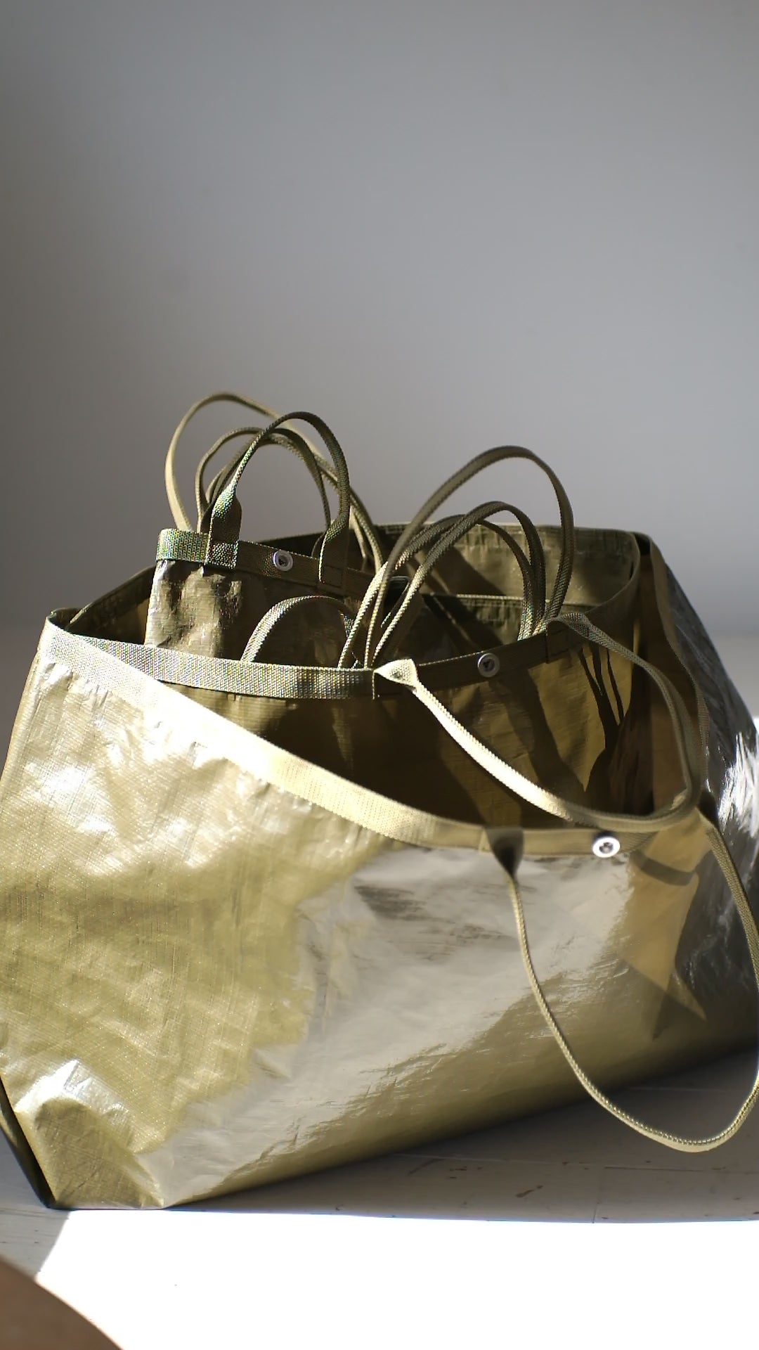 ループに付いたゴム紐は折りたたむ時に便利です。これで用途がぐんと広がって、キャンプやビーチや雪山へのレジャーから、エコバッグとしてスーパーや海産物の買い出しまで、また雨の日の外出やロケや・・・もう他のトートはいらなくなるかも。