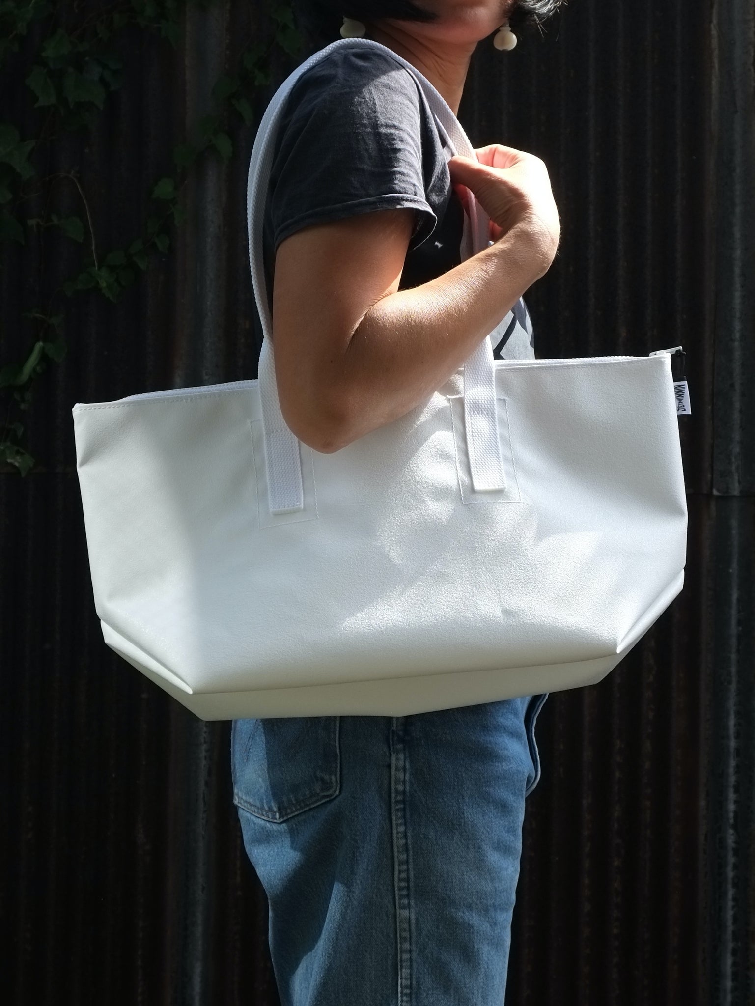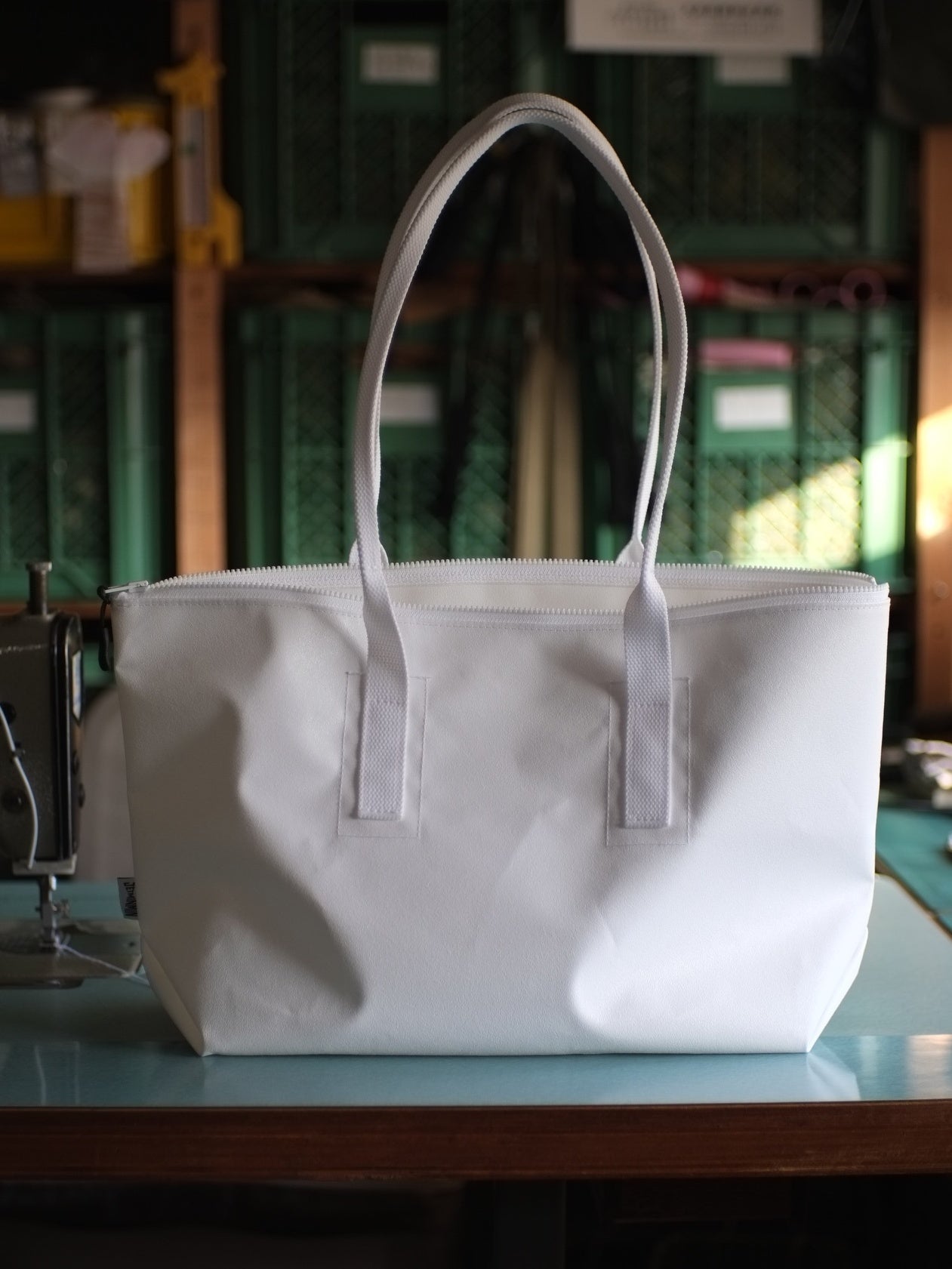 私達はこれを使って底部分に縫い目のこない製法でマチを作ることで、キャンプ場などの汚れた地面や雪山やビーチで使えるマチ付きトートバッグを制作しました。ただ、側面の縫い目からは多少の水分の進入はありますので「ちょっと防水」としています。
