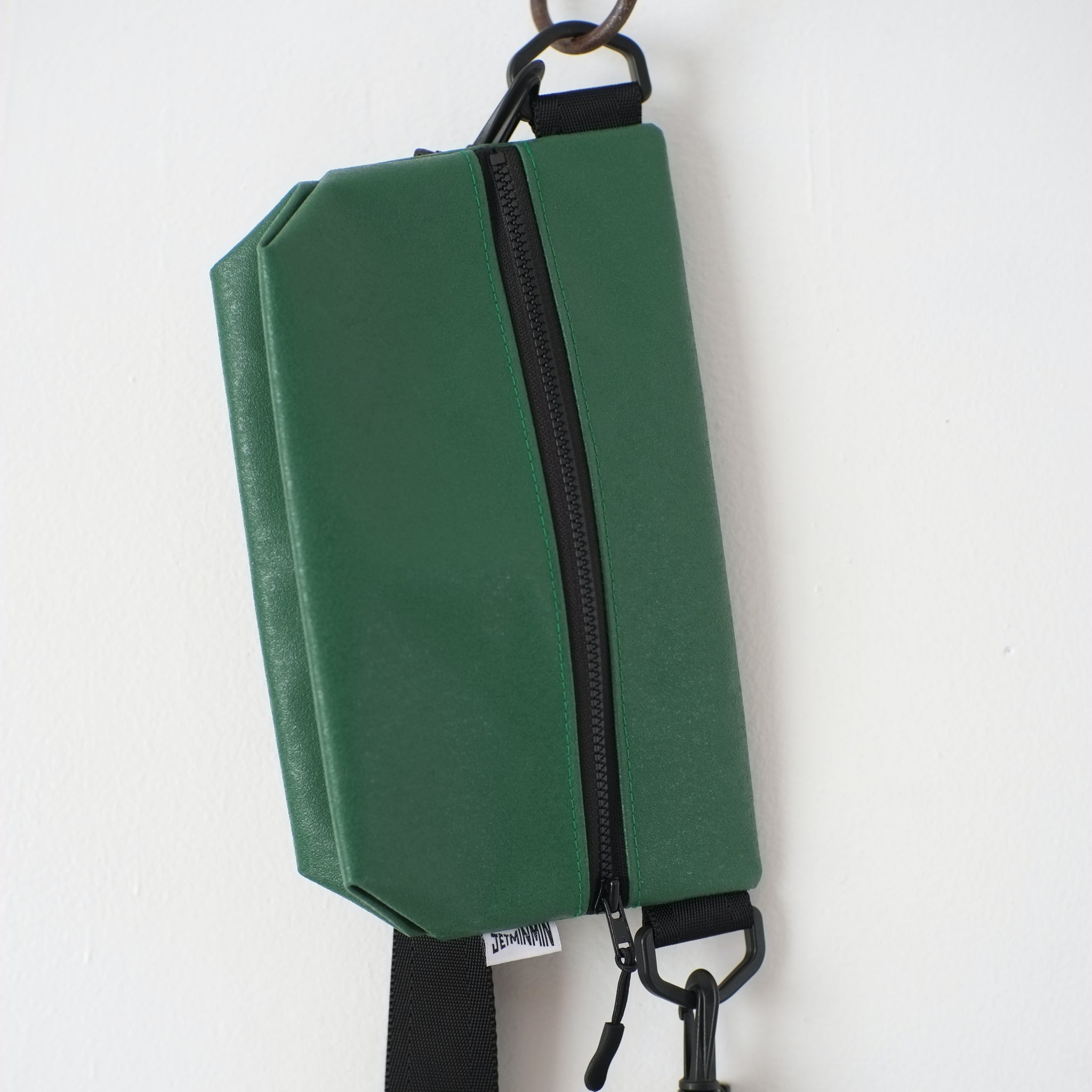 ジッパー巾25cmのビニールテント地のボディーに、長さを自由に調節可能な浜松産シートベルトをセットした、シンプルな斜めがけバッグです。長財布とスマートフォンとエコバッグを持っていくのにちょうど良いサイズ。
