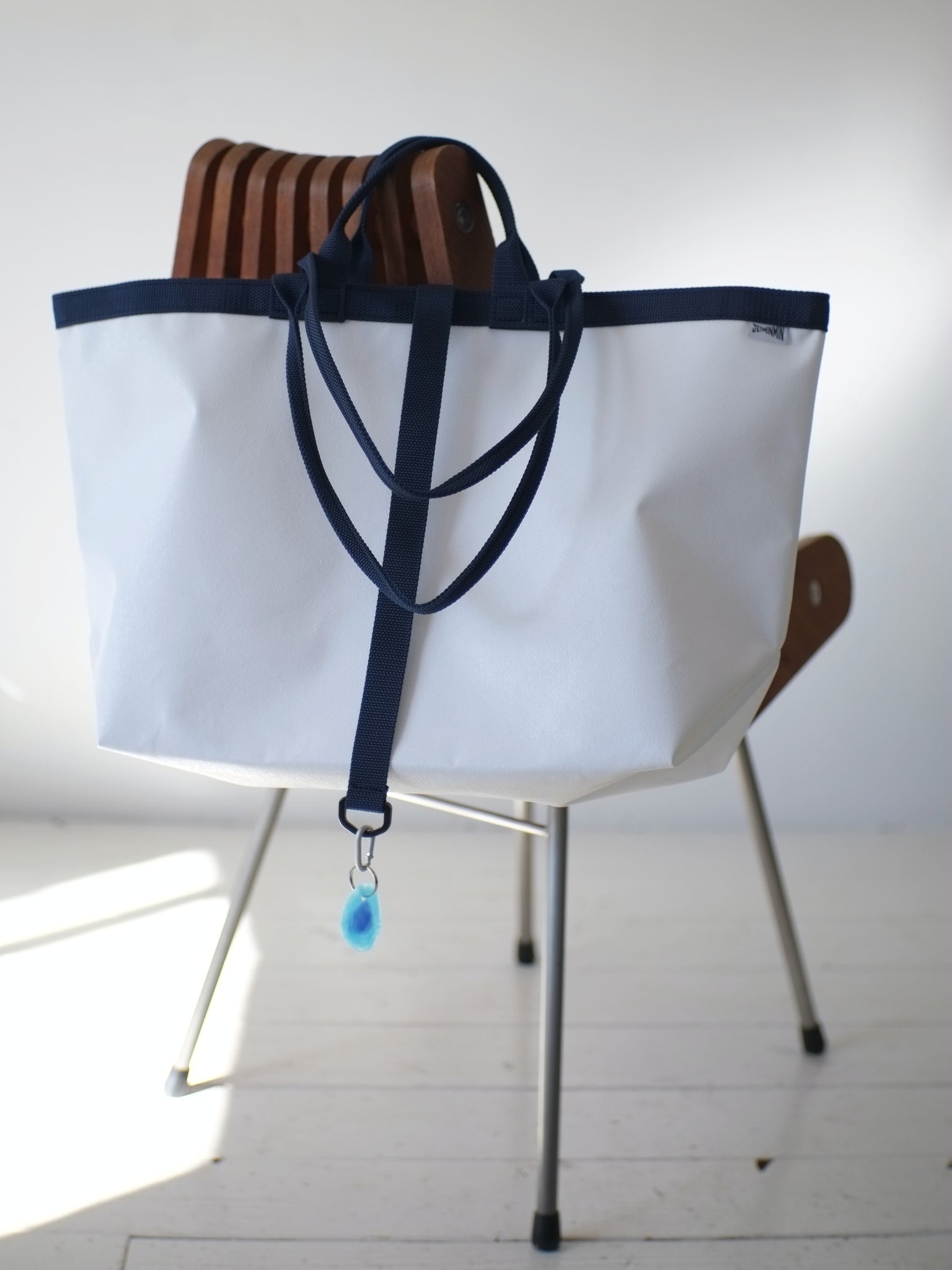 このビニールトートは活躍の幅が広いので、通勤から休日のお出かけまで毎日メイントートとしてお使いくださる方が多く、そんなみなさまからキーがバッグの中で迷子にならなくて済む機能が欲しいというご要望をいただいたので、小さなカラビナ付きキーループを標準装備にしました。
