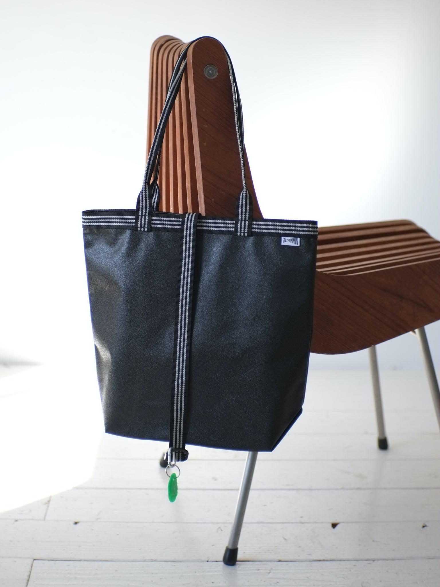 このビニールトートは活躍の幅が広いので、通勤から休日のお出かけまで毎日メイントートとしてお使いくださる方が多く、そんなみなさまからキーがバッグの中で迷子にならなくて済む機能が欲しいというご要望をいただいたので、小さなカラビナ付きキーループを標準装備にしました。