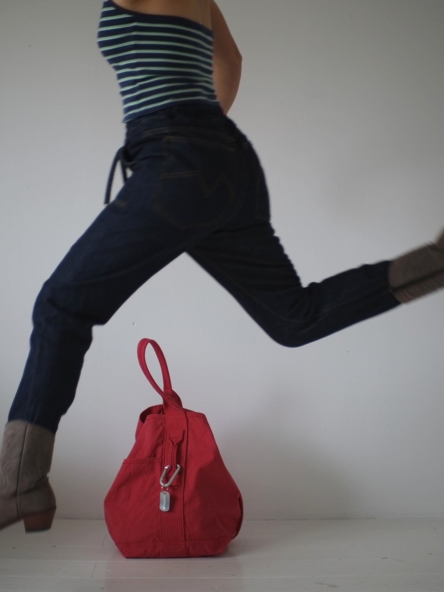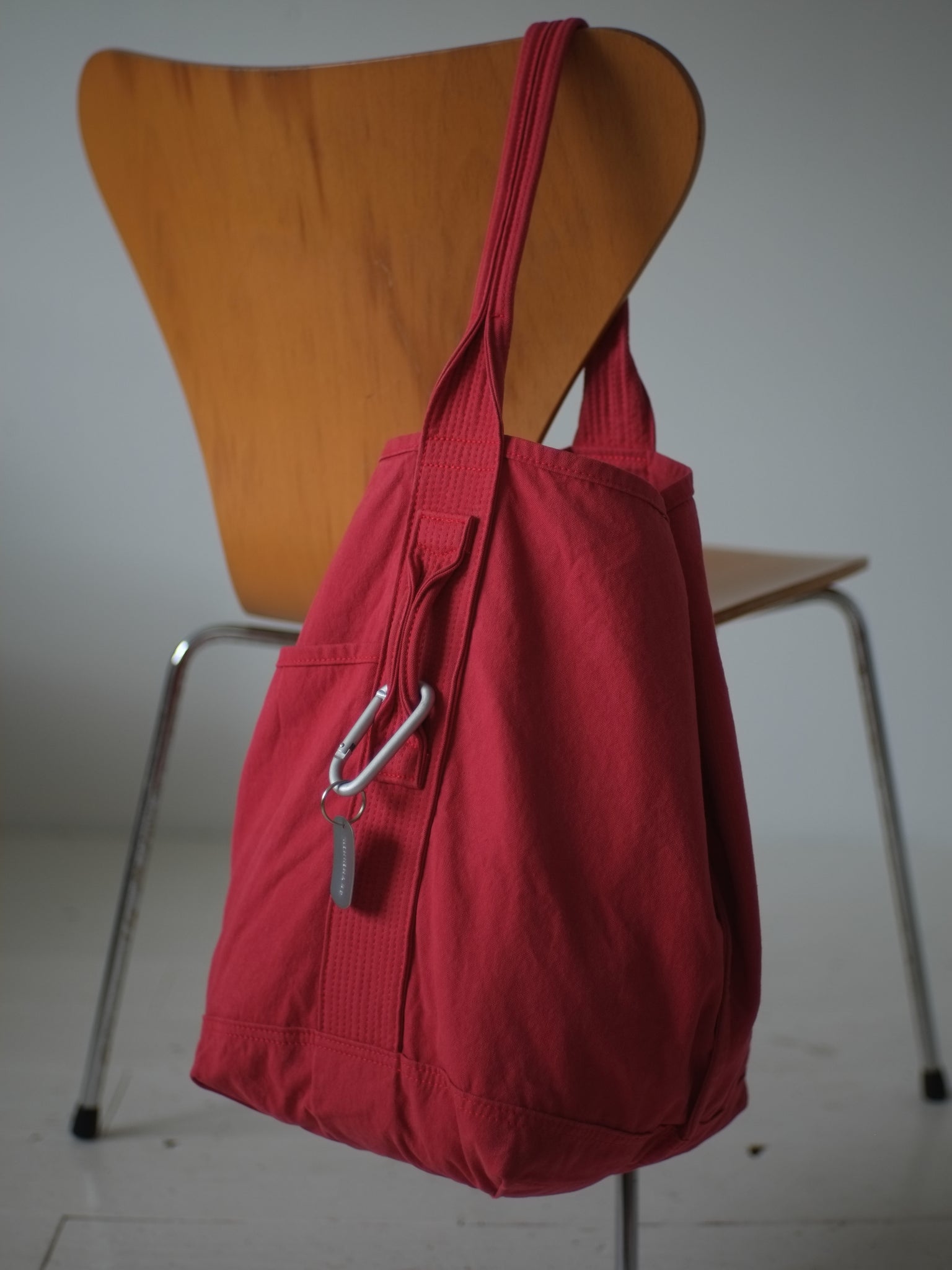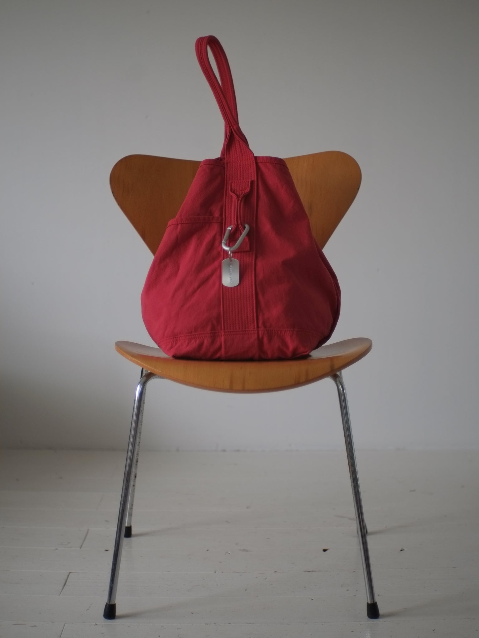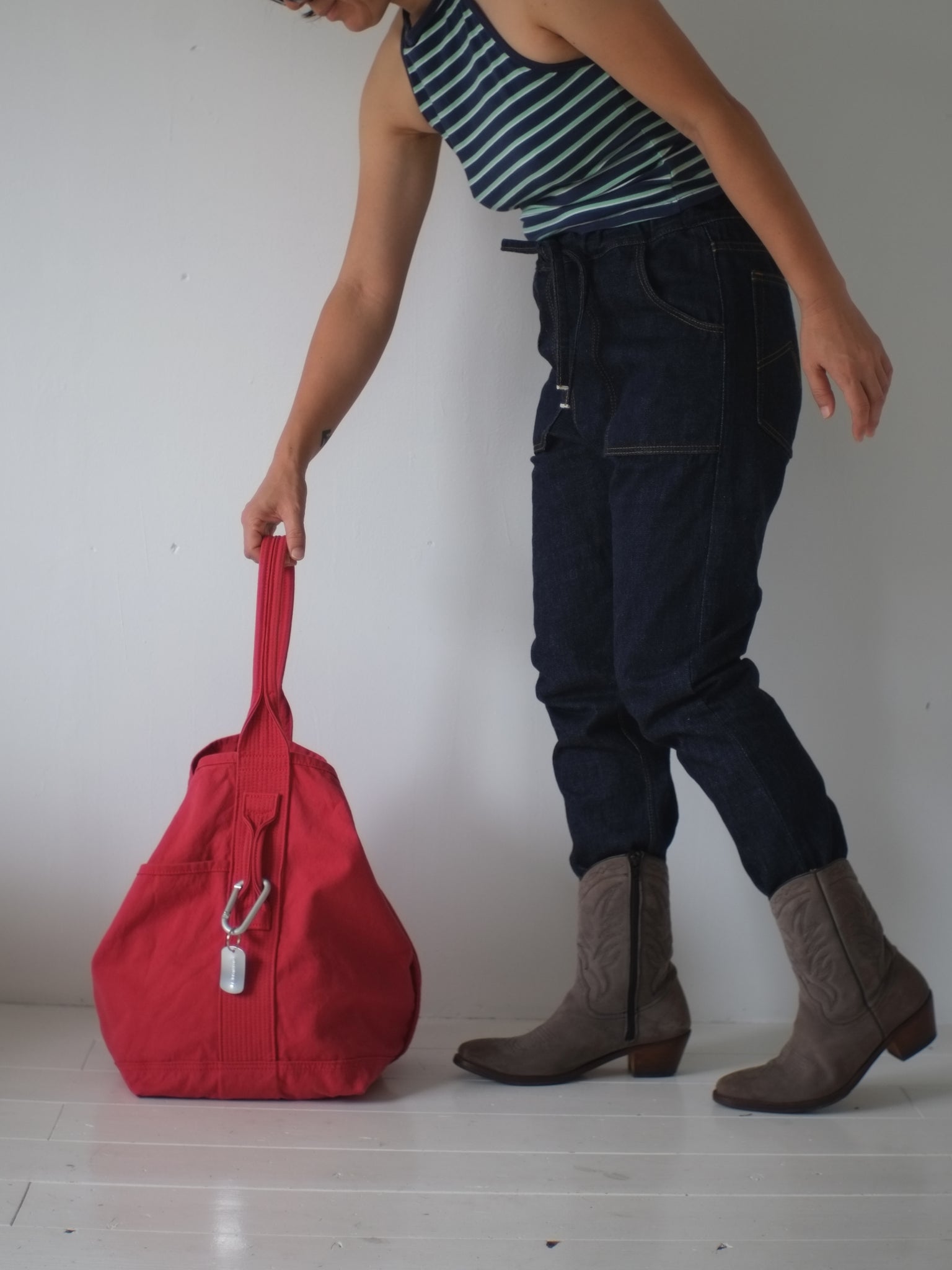 小さな子供を抱えたママが、パッとワンアクションでトートバッグを肩掛けするためには、バッグのハンドルを1本にしなければ、と、試行錯誤の末に出来上がったシングルショルダートート。中身がこぼれにくいように口をすぼめるバックルを付けたら洋梨のような不思議な形になりました。