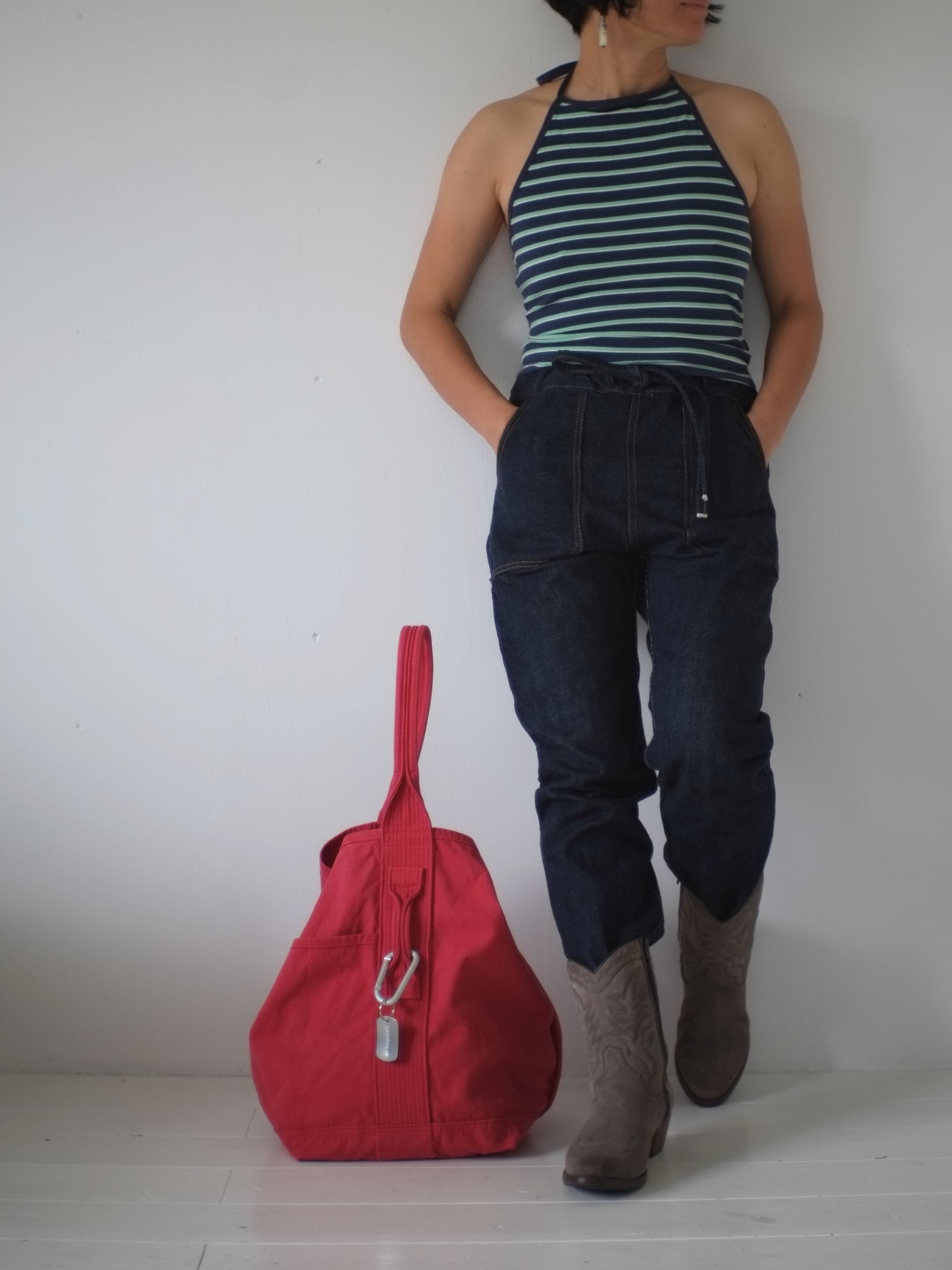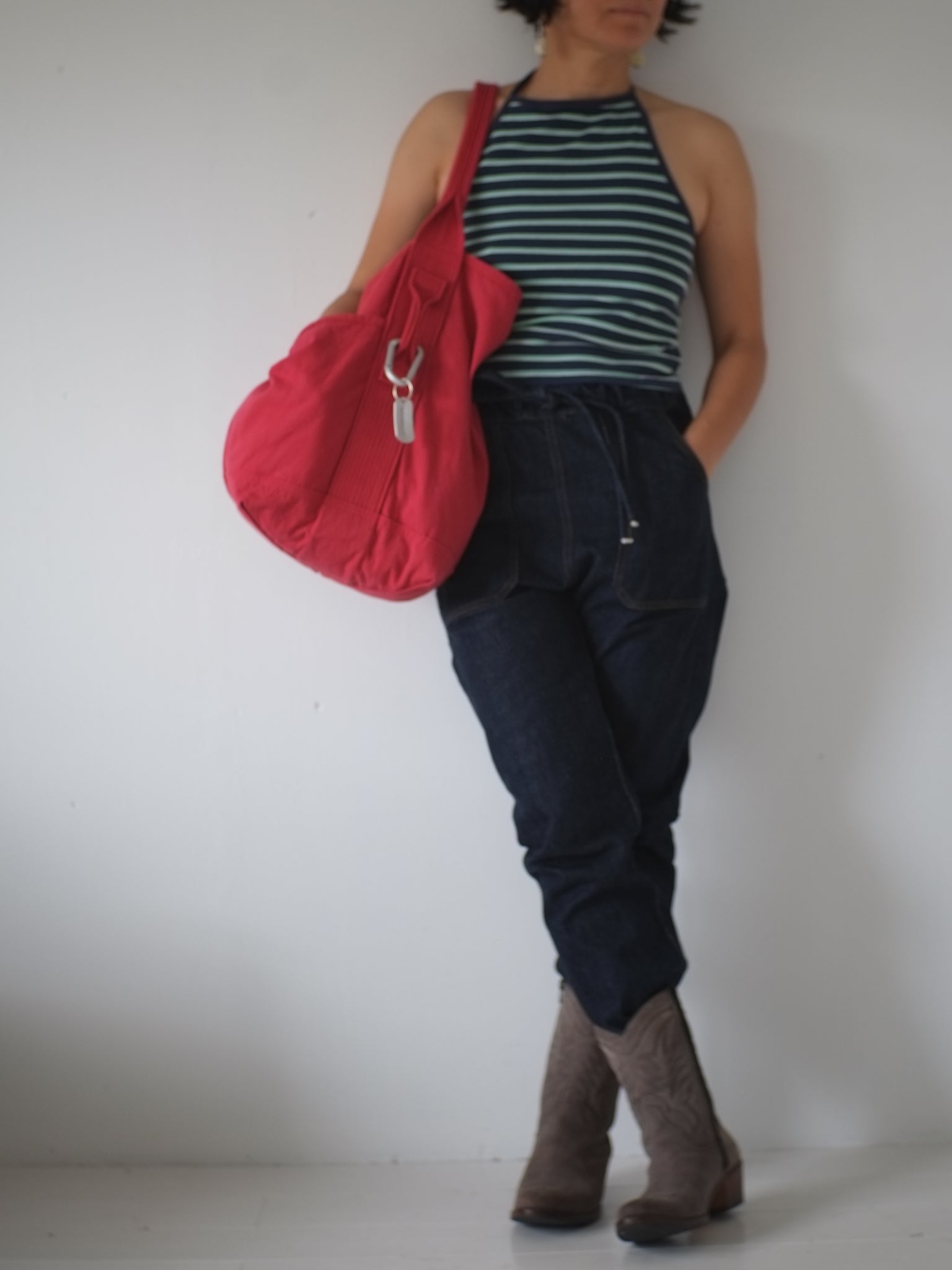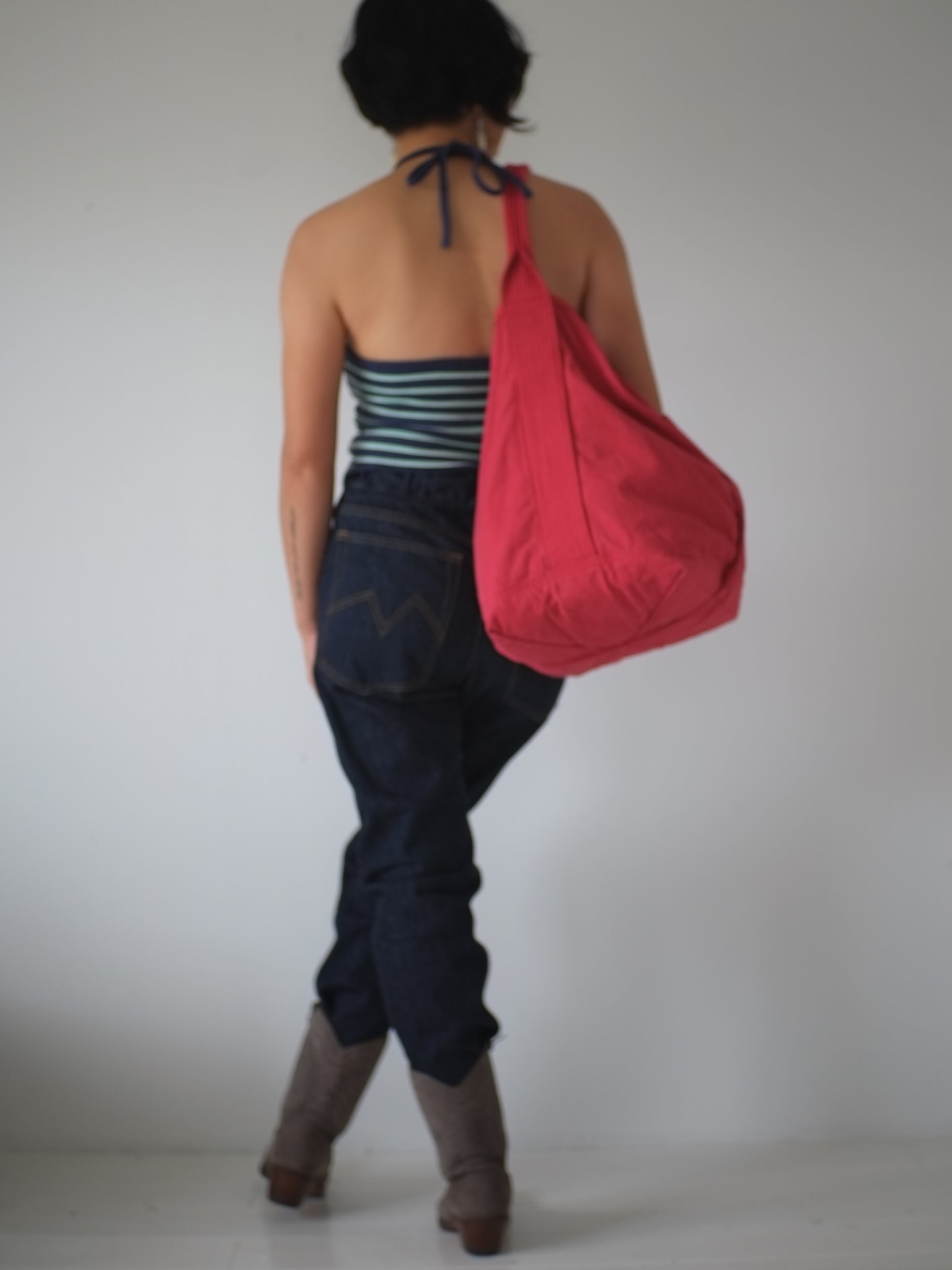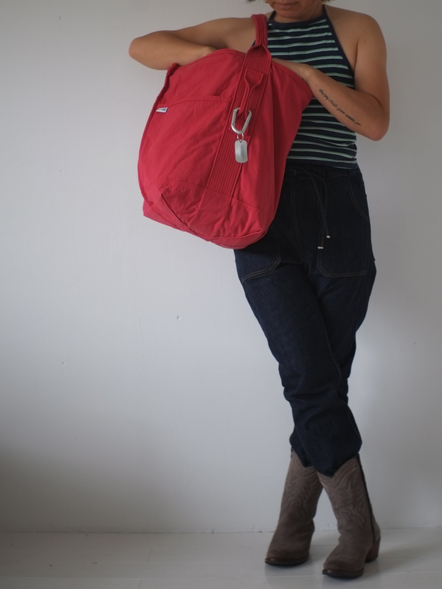 小さな子供を抱えたママが、パッとワンアクションでトートバッグを肩掛けするためには、バッグのハンドルを1本にしなければ、と、試行錯誤の末に出来上がったシングルショルダートート。中身がこぼれにくいように口をすぼめるバックルを付けたら洋梨のような不思議な形になりました。