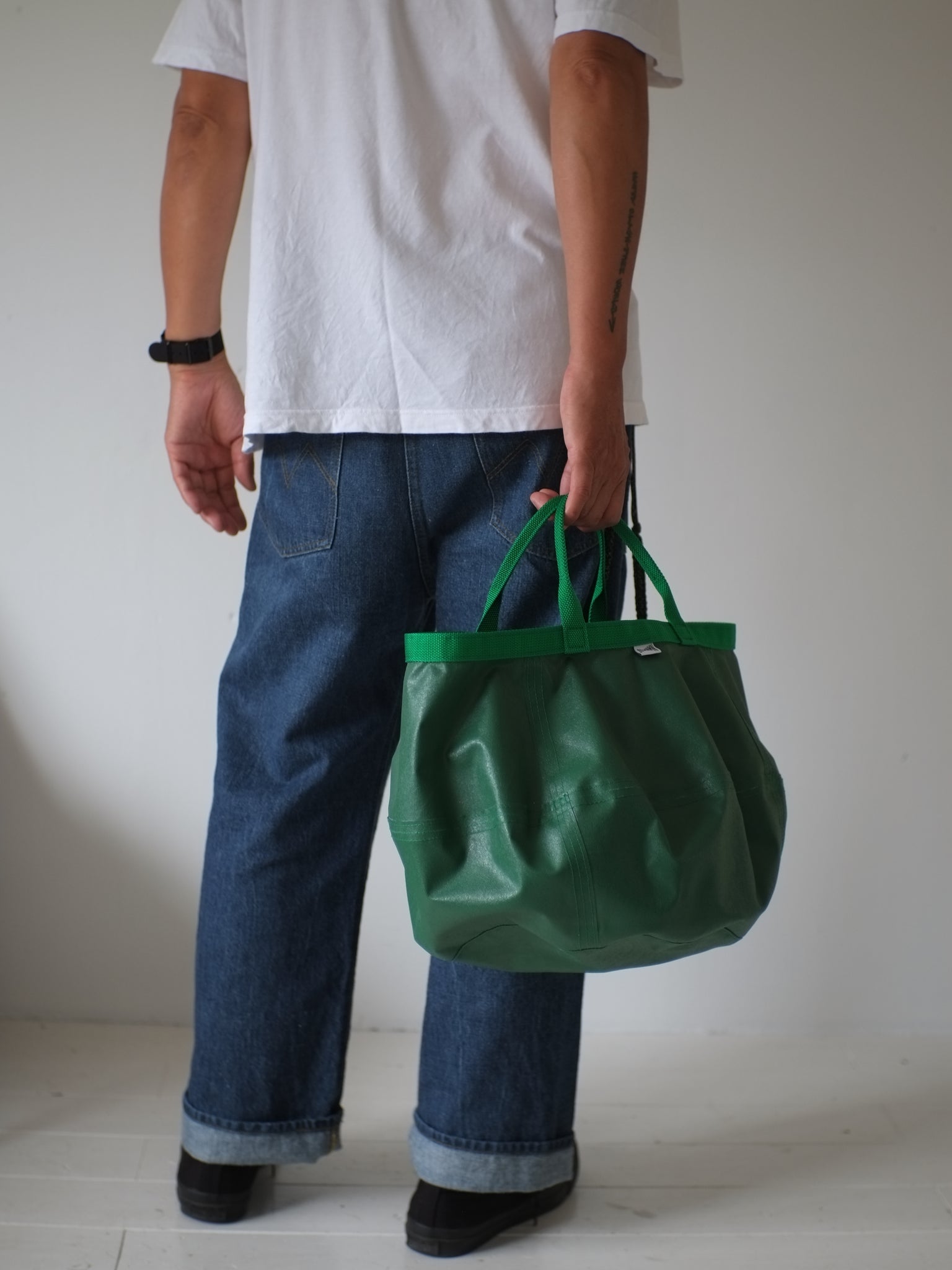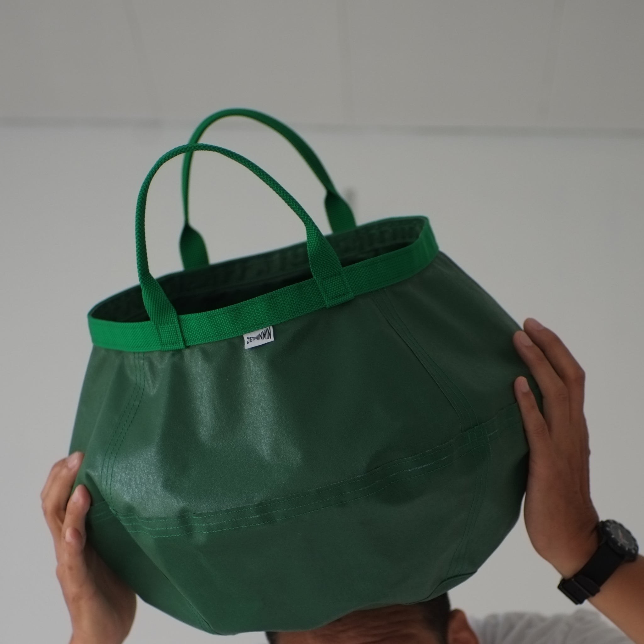 愛知の寺田商会さんからテント素材の供給を受けてJETMINMINが制作しています。工場の屋根やお店のオーニングやトラックの幌などに使用される防水の丈夫な生地です。縫い目からの水の侵入はあります。