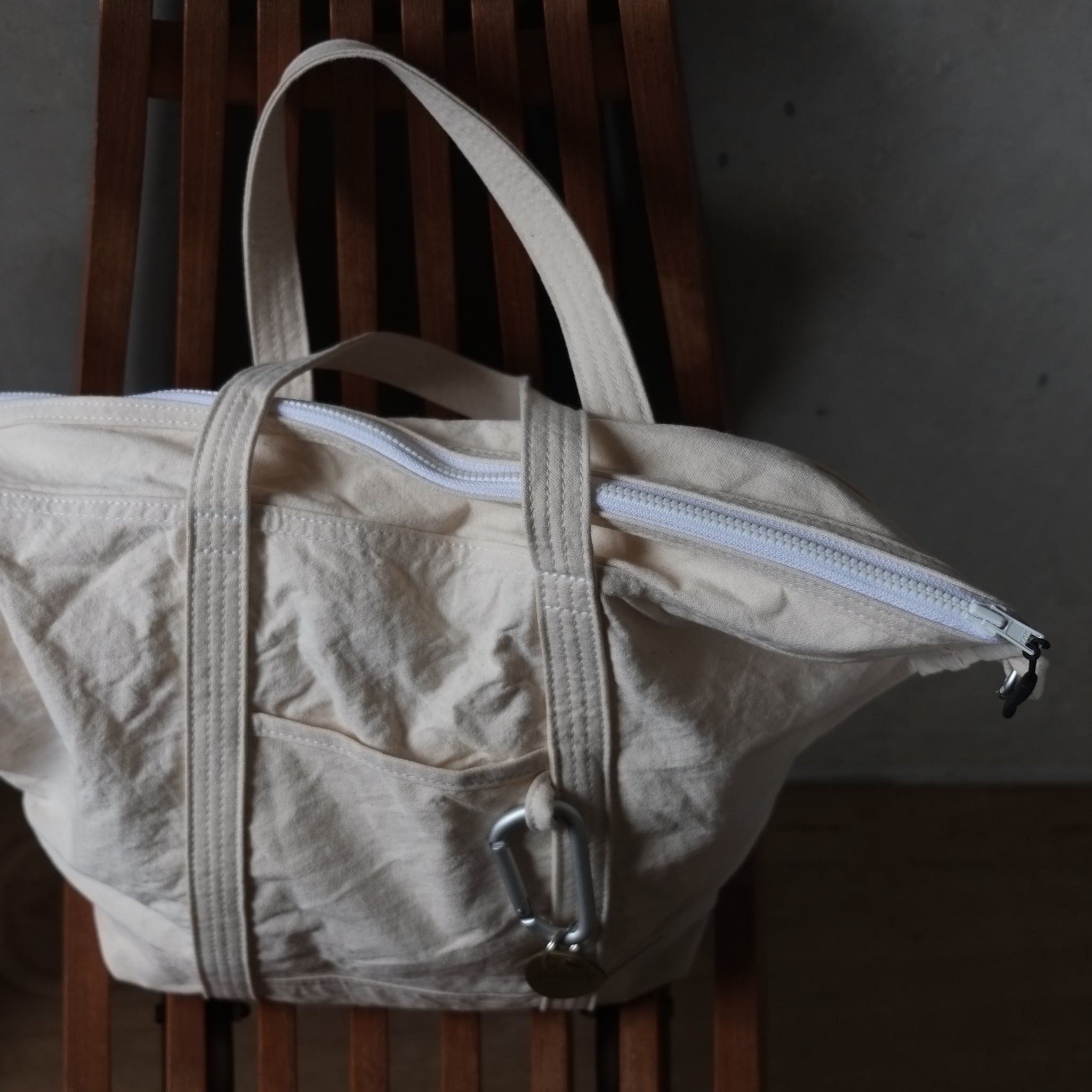 It is made from Japanese cotton canvas No. 11. The zipper is white.