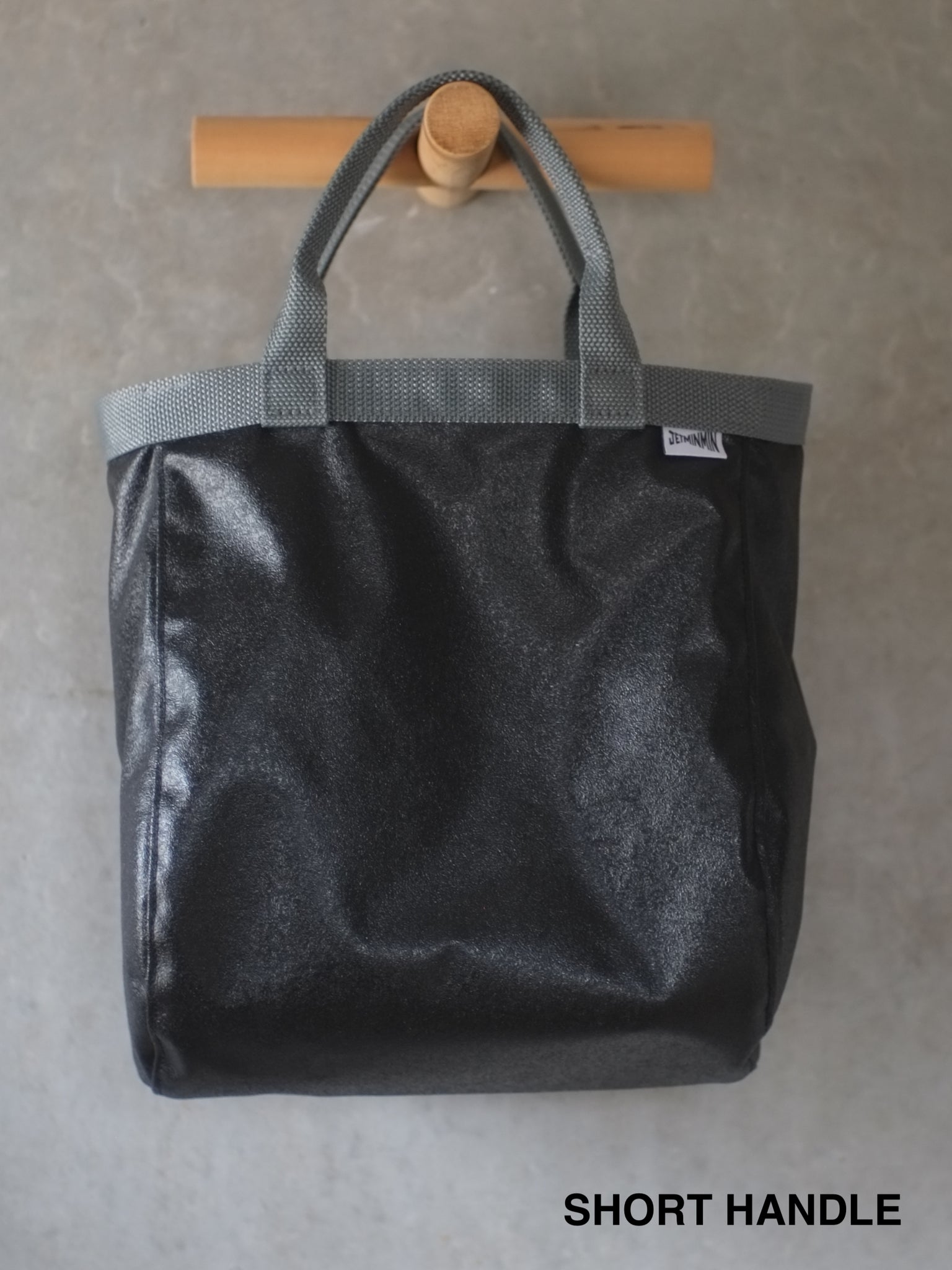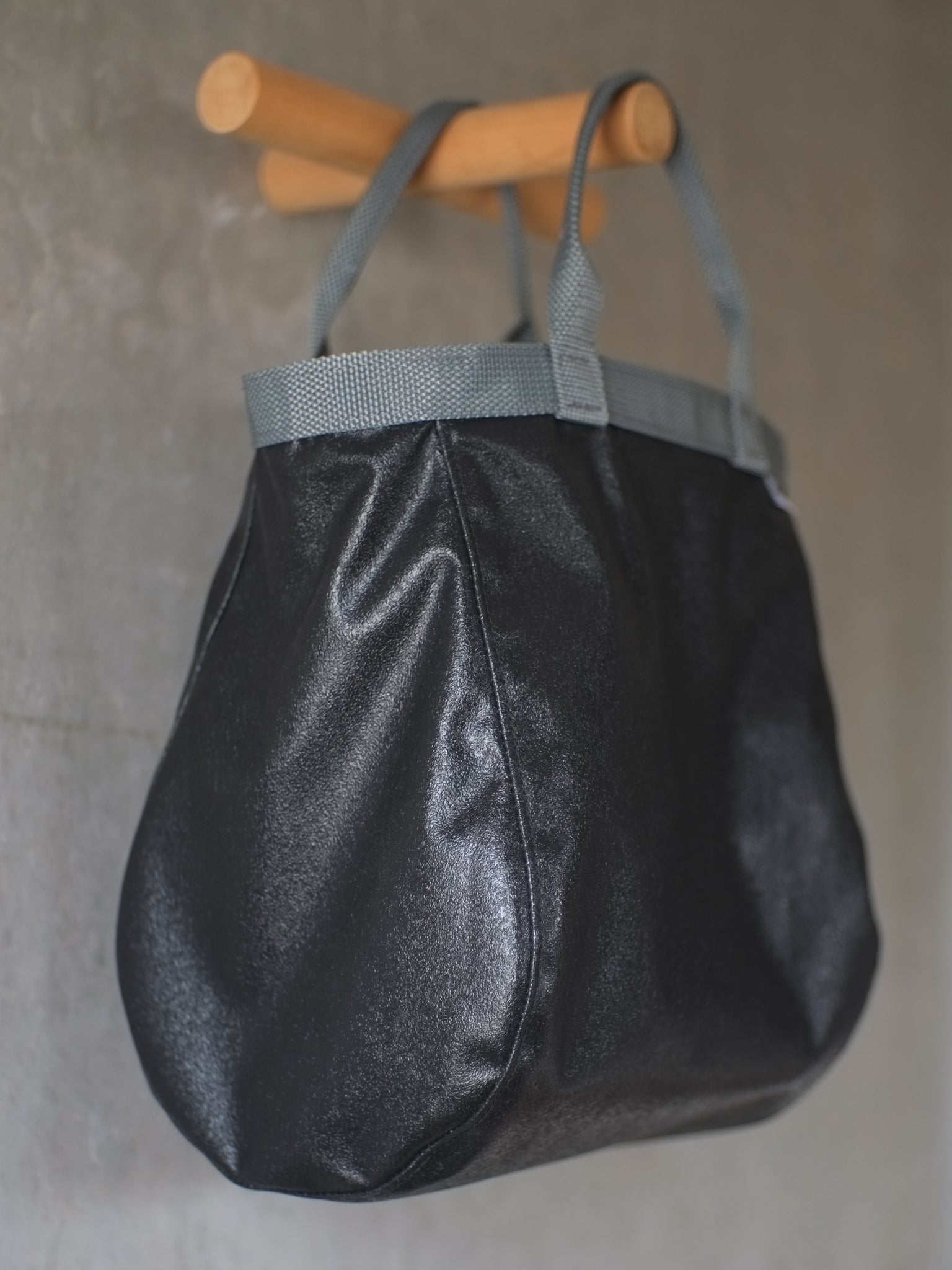 A slightly waterproof tote made from vinyl tent material.