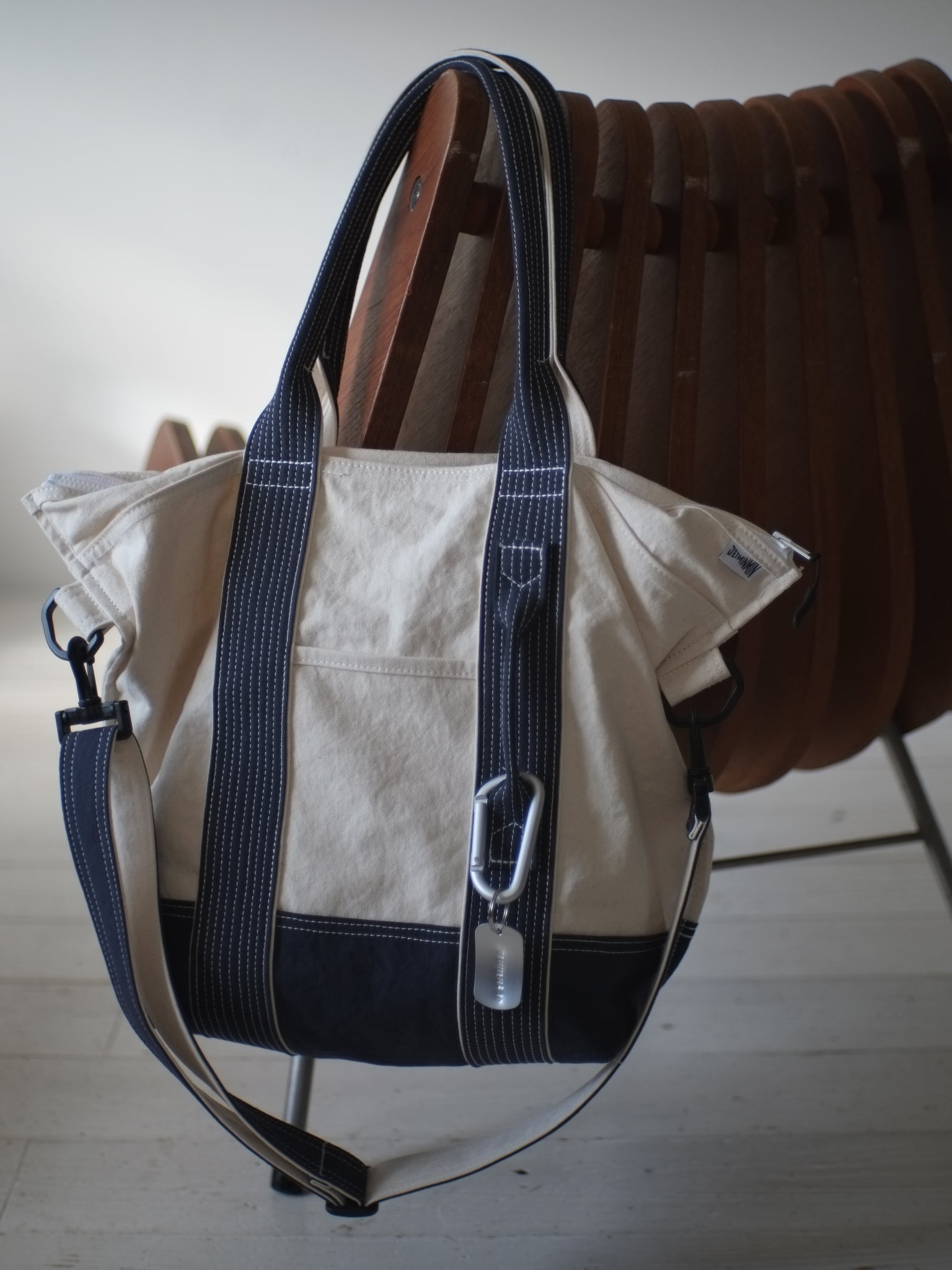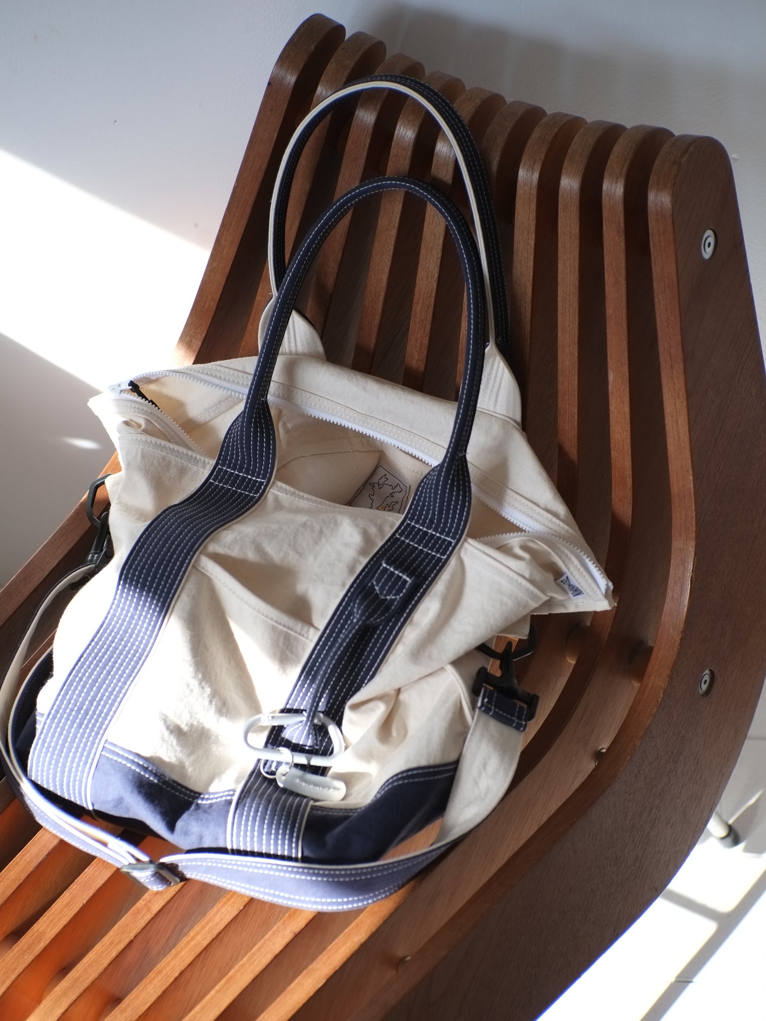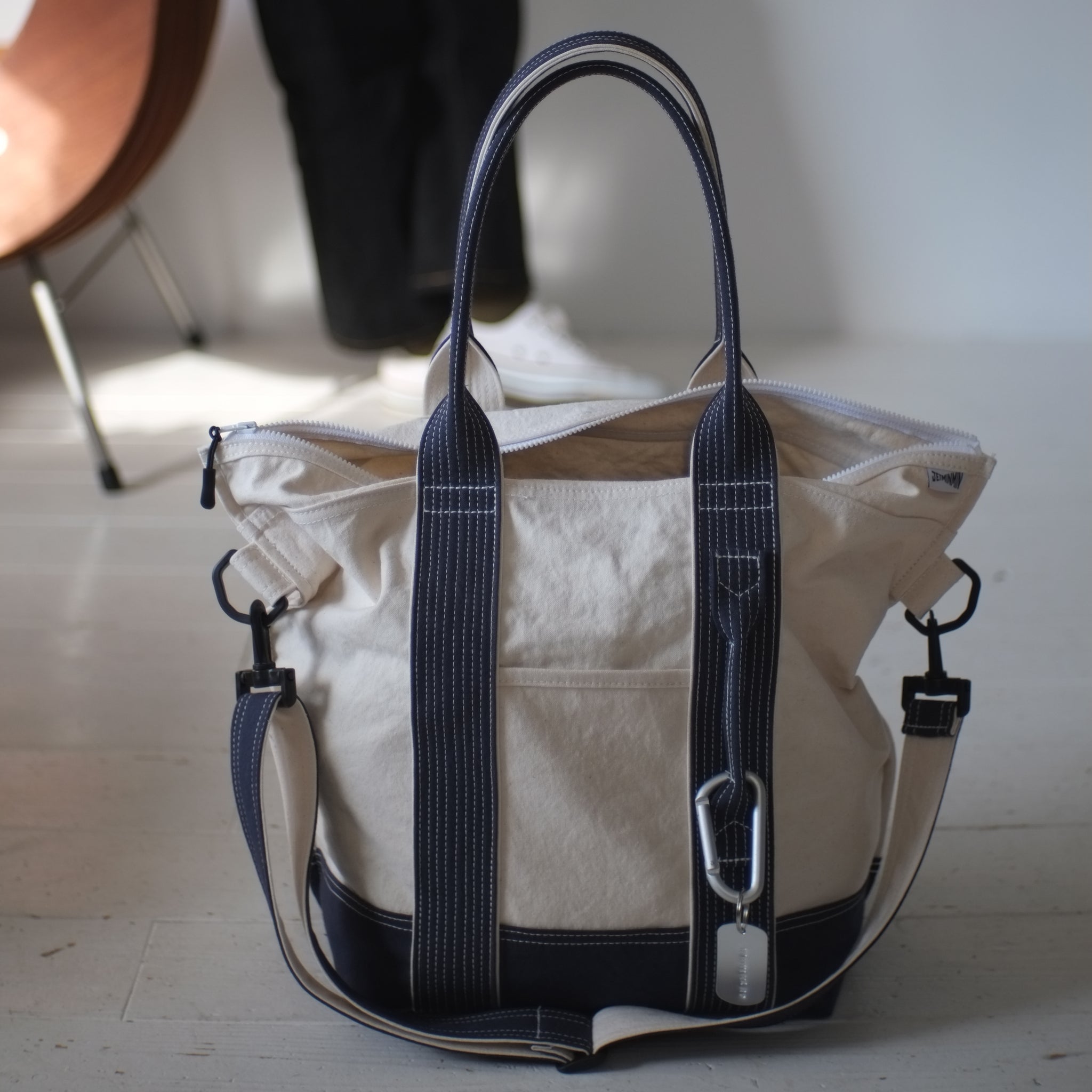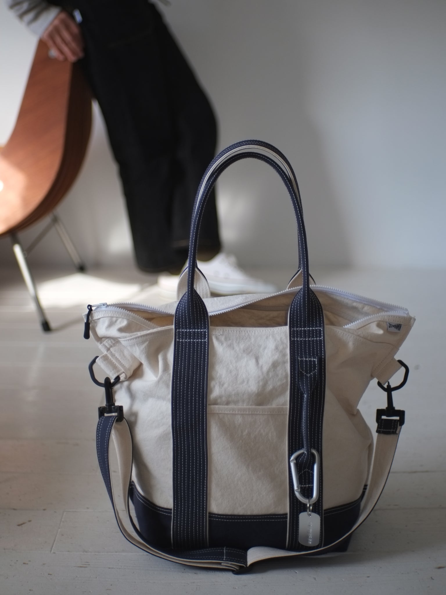 A4タテ型マチ広めトート"BALLOOON!-45-HI"に、ジッパーと斜め掛けストラップの付いた "ZIP-BALLOOON!-45-HI+STRAP" が完成しました。