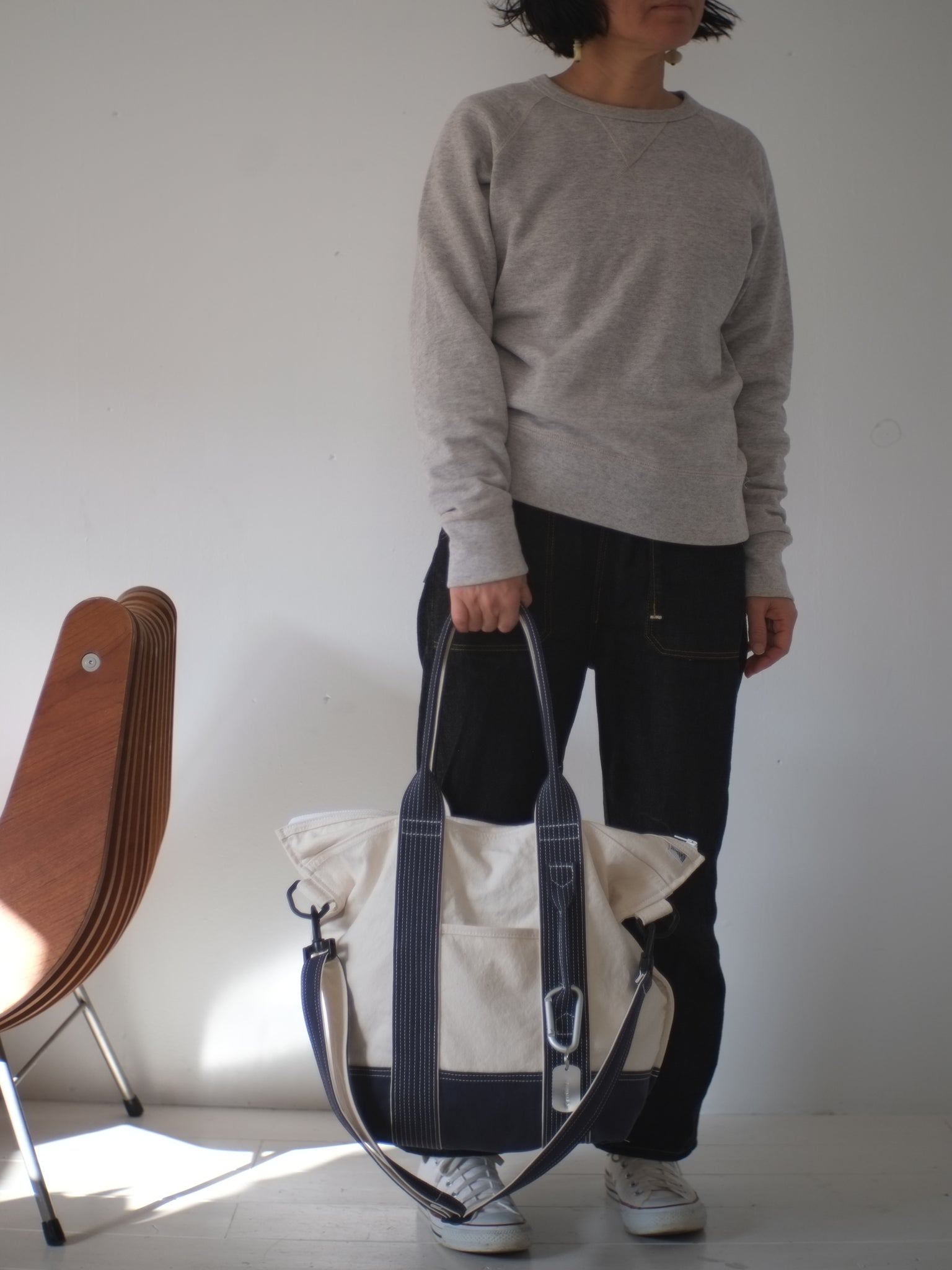 JETMINMINの布のトートのいいところは、カチカチに厚い生地を使っていないから、こんな風に荷物をパンパンに入れたらパンパンな形になるし、荷物が少なければ、もっと小さなトートに見えてスタイリングがこなれた感じになるところ。